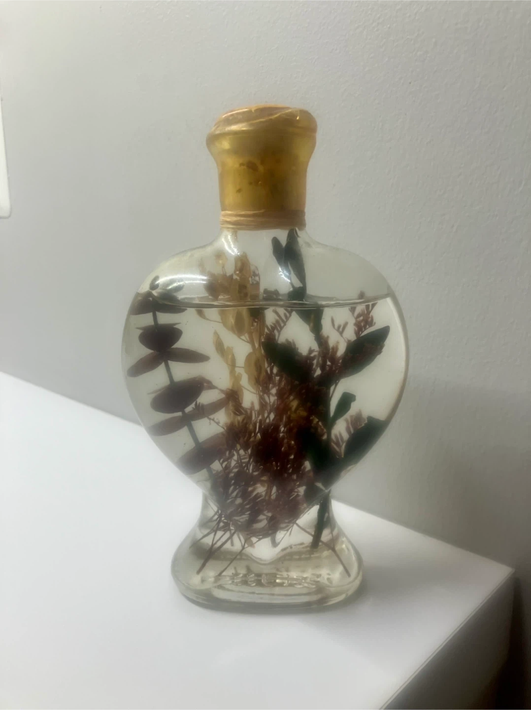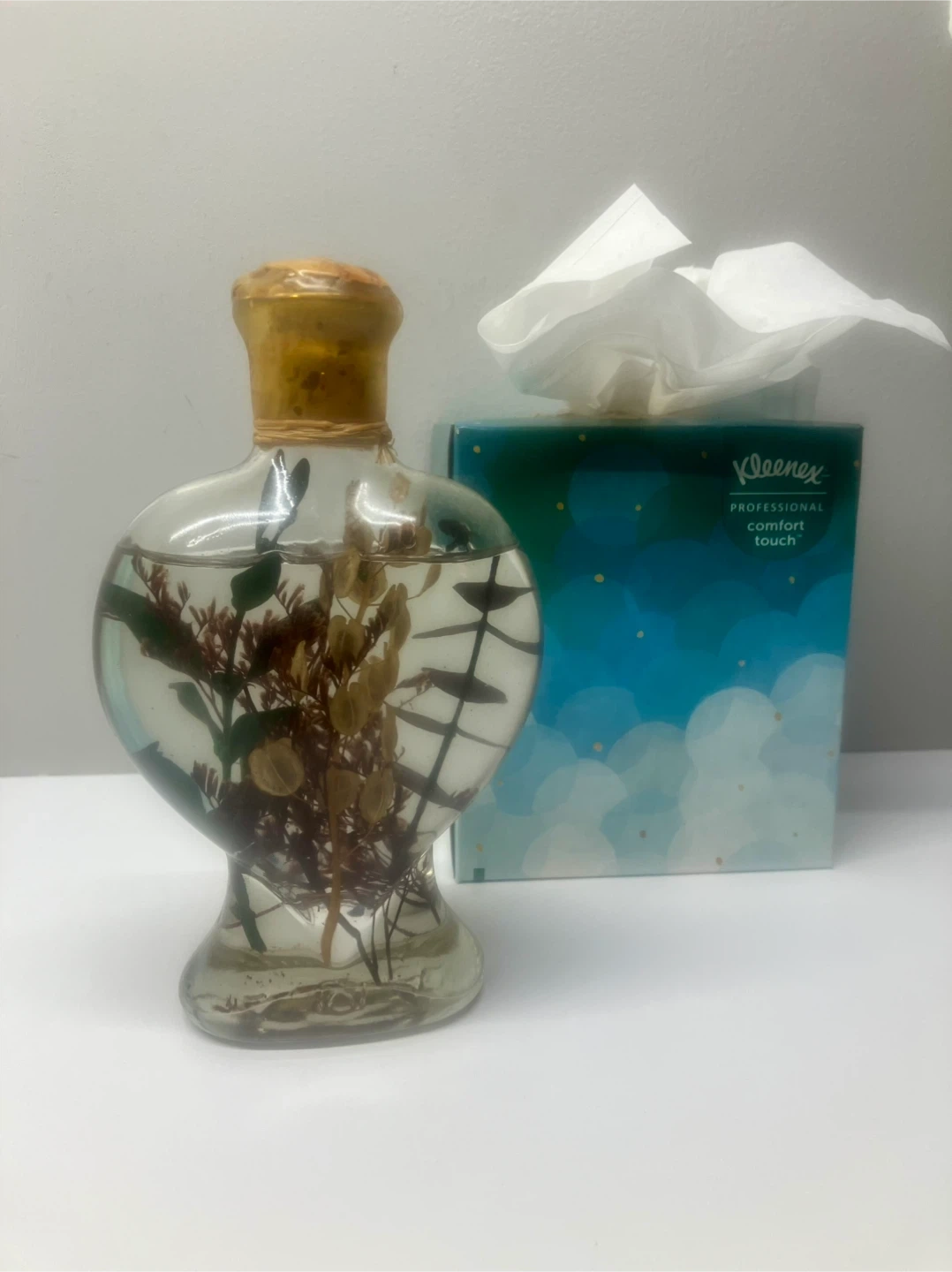 94Vintage Heart Shaped Botanical Decor Bottle - 6.5” x 4” Versatile decor item that works well in bathrooms, kitchens, dinner table etc. Heart shaped glass bottle measures 6.5” tall x 4” wide. From a smoke and pet free home. Check out in person before purchasing. Thanks for looking.