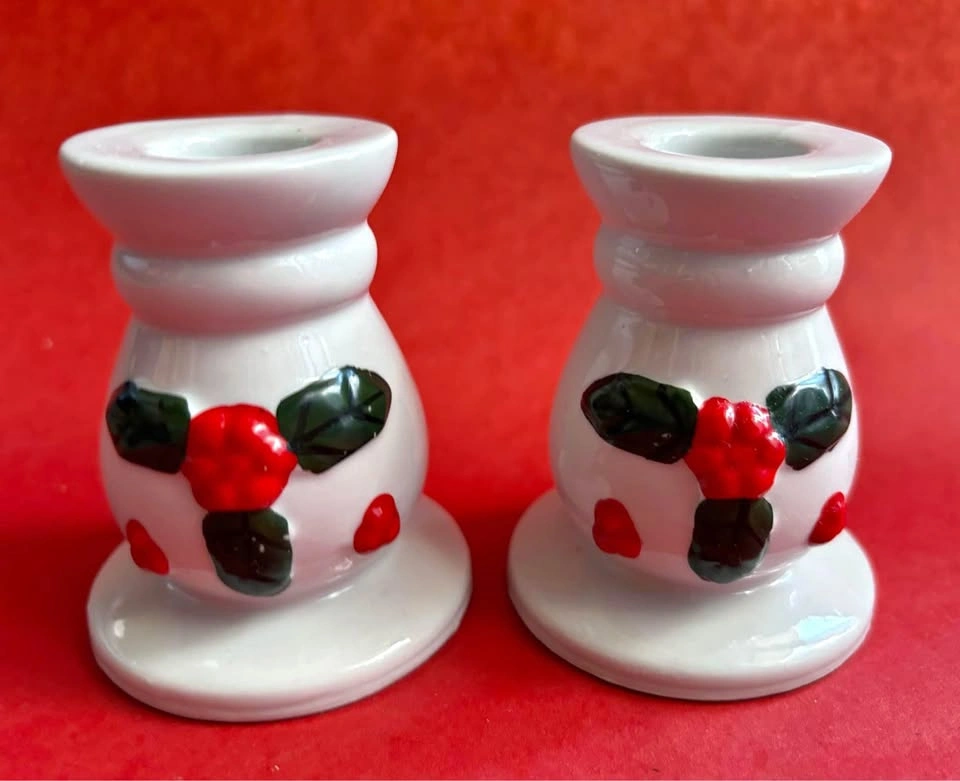 15Vintage Christmas candlestick holders, never used. White with red & green holly pattern. * Add a little holly to the holidays with the festive and fun candlestick holders Measurements: * Accommodates taper candle of .75” diameter * Height: 3” * Bottom Base: 2.5” round