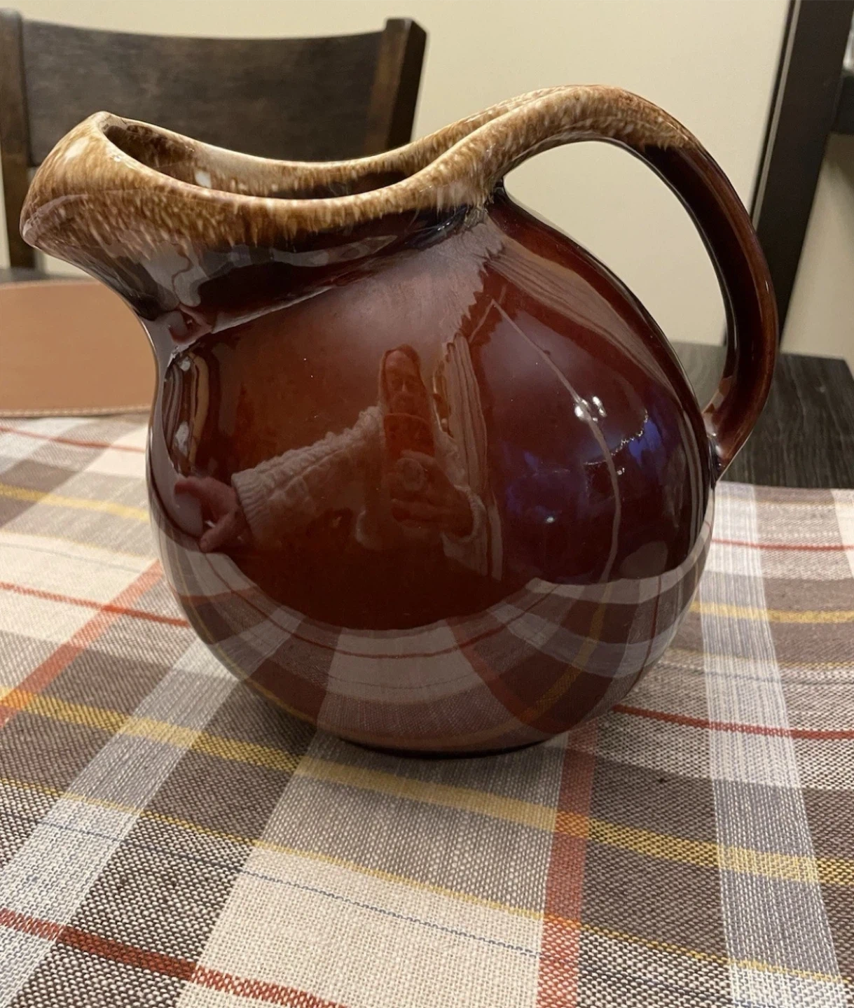 60Selling a vintage Hull Pottery pitcher with a brown drip glaze. It's in great condition and would look lovely in any home! The coloring is a deep brown and would be perfect for any collection