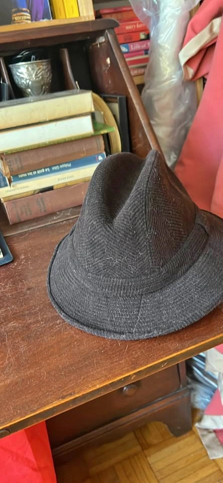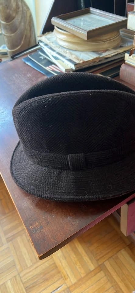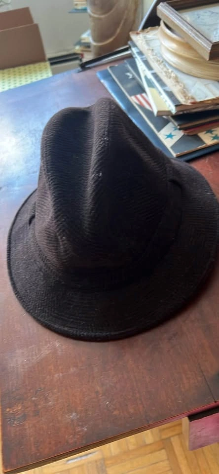 This is a fedora hat. Description: The image shows a dark-colored fedora hat, likely made of felted wool, with a creased crown and a brim. Style: Fedoras are a classic and timeless style of hat, often associated with a sophisticated or vintage look. Pick up.