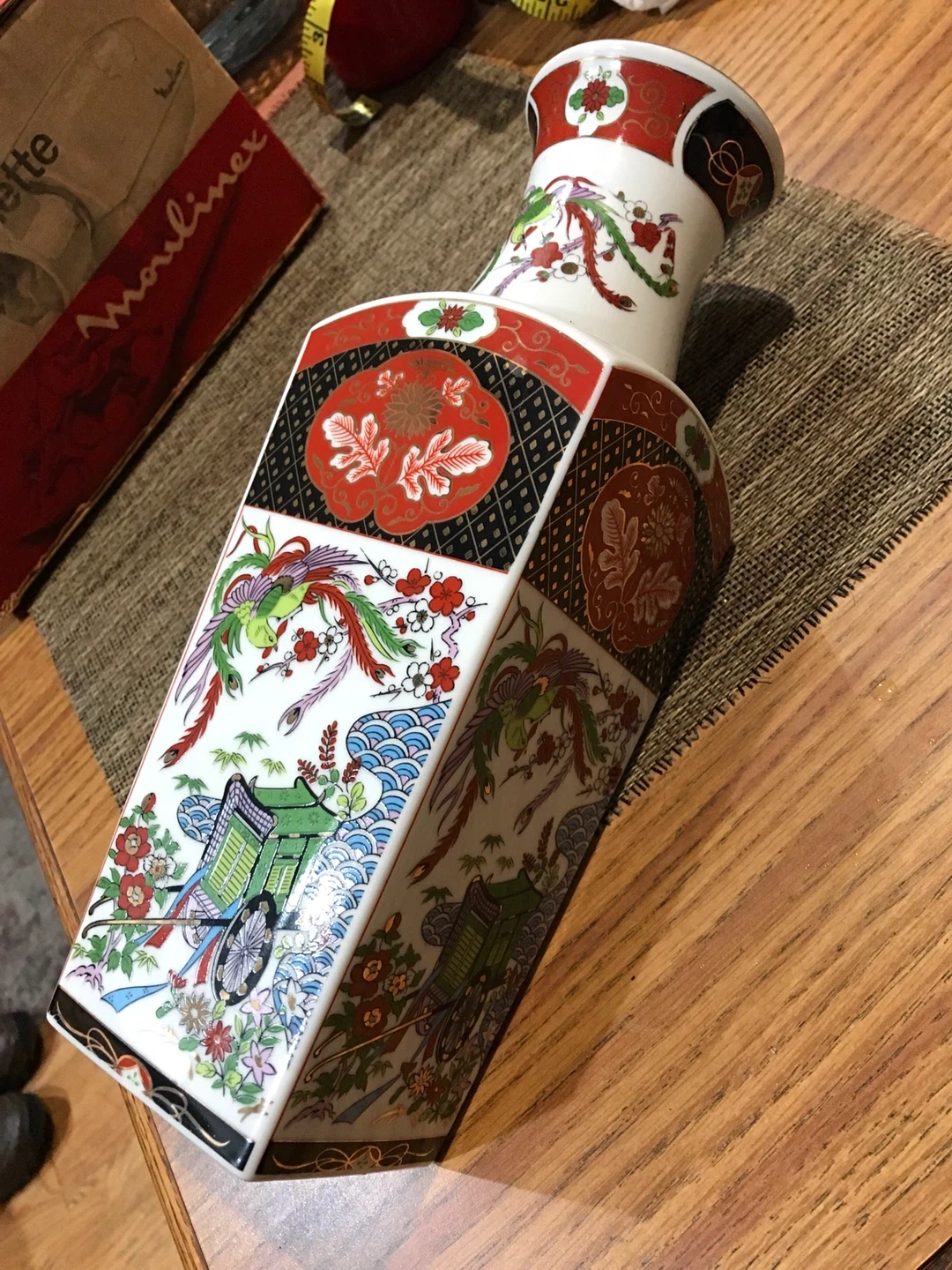 168This is a beautiful vintage Japanese vase featuring a unique design with floral patterns and a traditional carriage scene. It's in great condition and would make a lovely addition to any home decor