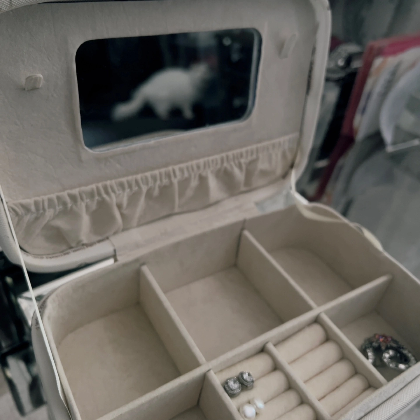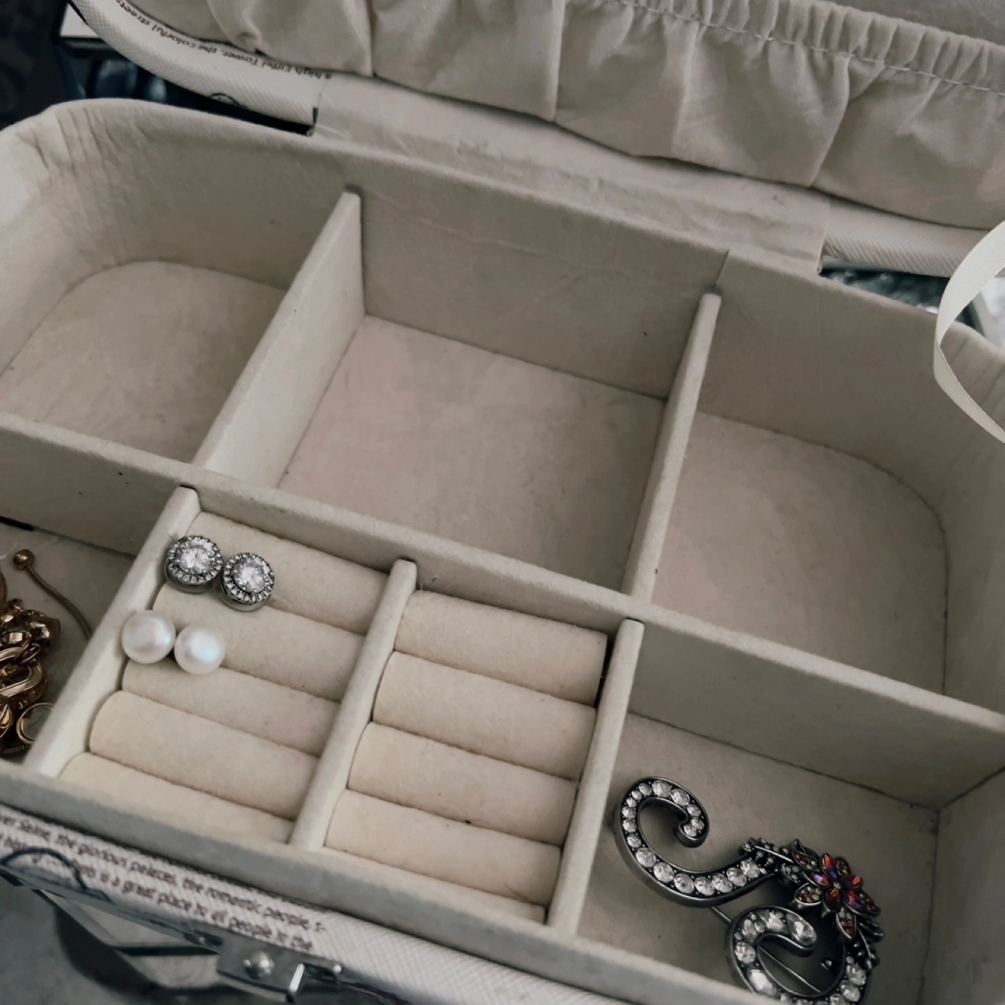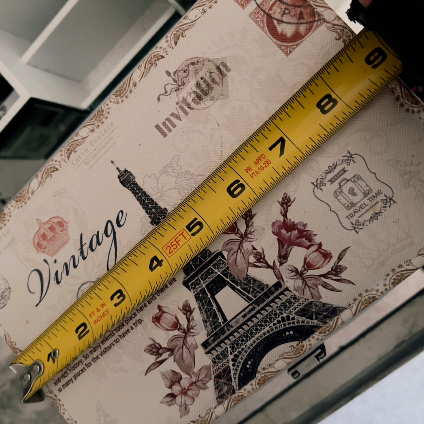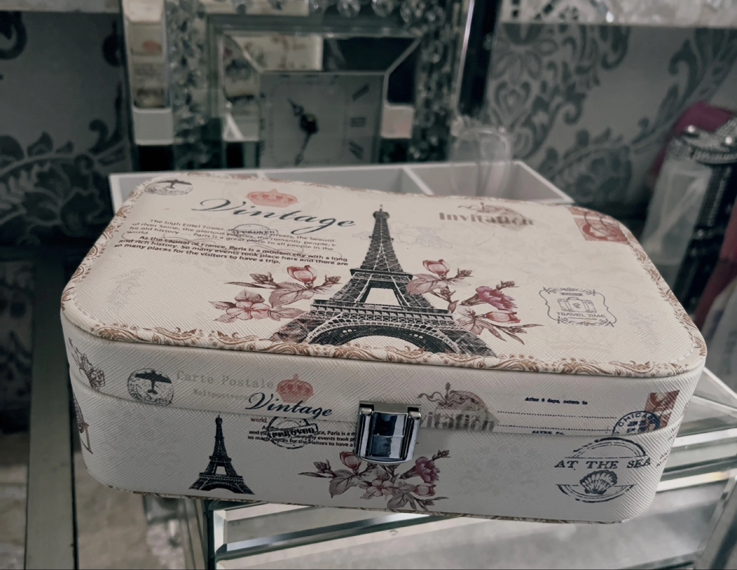 Cute vintage jewelry box with an invitation design! It is about 4 inches wide and perfect for storing your jewelry or small accessories. It has different compartments to keep your items organized