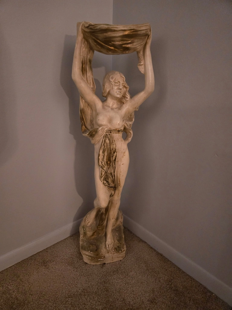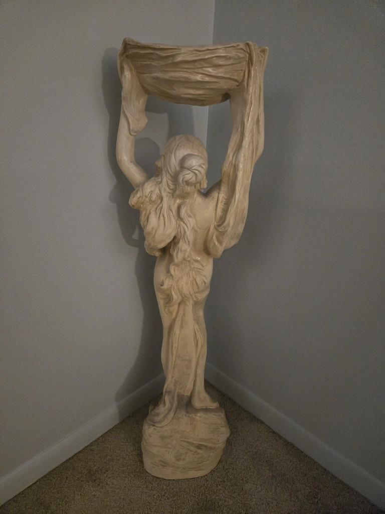 15Unique vintage statue. Features a woman holding a bowl. Great for indoor or outdoor decor. Adds an elegant touch to any space. Cream-colored finish. Excellent condition.