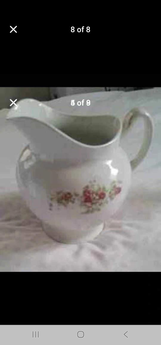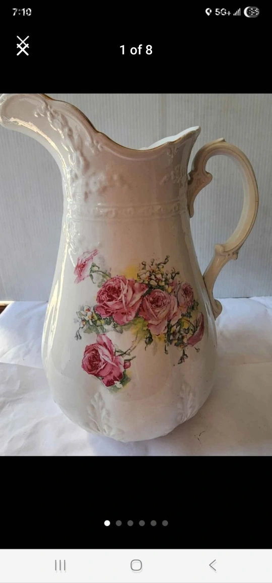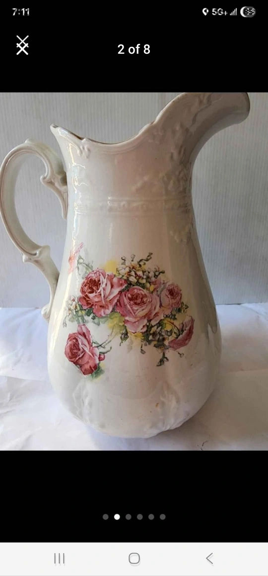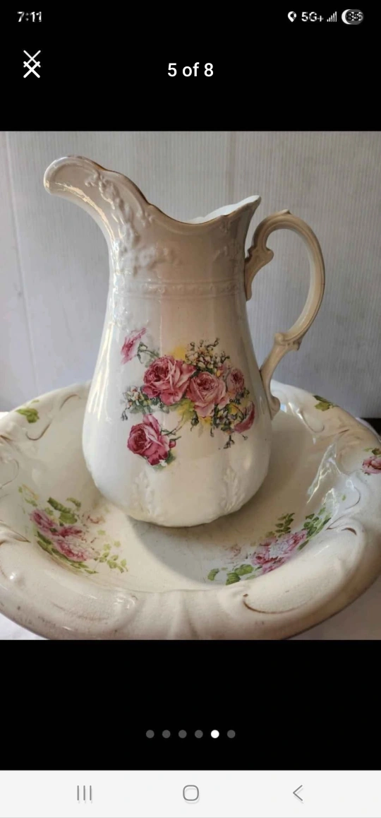 VINTAGE HANDPAINTED PITCHER WITH BASIN SET. OLD TIME COLLECTION 13 INCH HIGH - 9 IN H WIDE the BOWL 17 INCH DIA I PAID $150 $85 VINTAGE PORCELAN PITCHER FLORAL DESIGN 9" HIGH $30 VINTAGE PORCELAN PITCHER FLORAL DESIGN. 7" HIGH $30 VINTAGE PORCELAN PITCHER FLORAL DESIGN. 7" HIGH $30 PERFECT CONDITION, NO CRACKS, NO CHIPS OR BEST OFFER BUYER HAS TO PICK UP CASH ONLY
