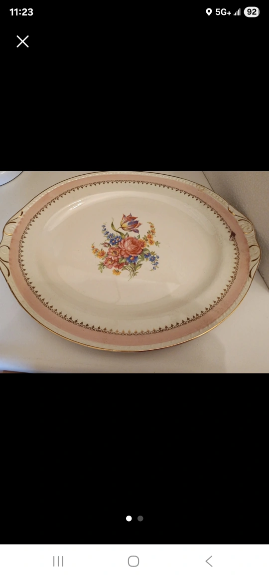 BEAUTIFUL VINTAGE SERVING PLATTER FLORAL DESIGN. PINK BORDER. GOLD ACCENTS NEVER USED JUST COLLECTED PERFECT CONDITION Made in USA. 13" x 16" $45 BUYER HAS TO PICK UP CASH ONLY