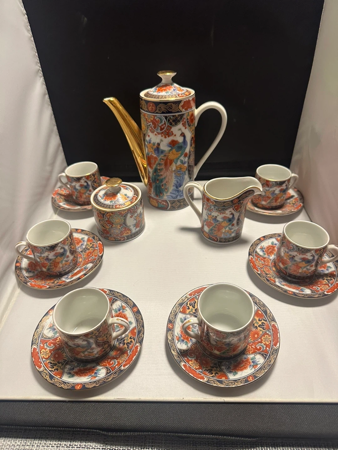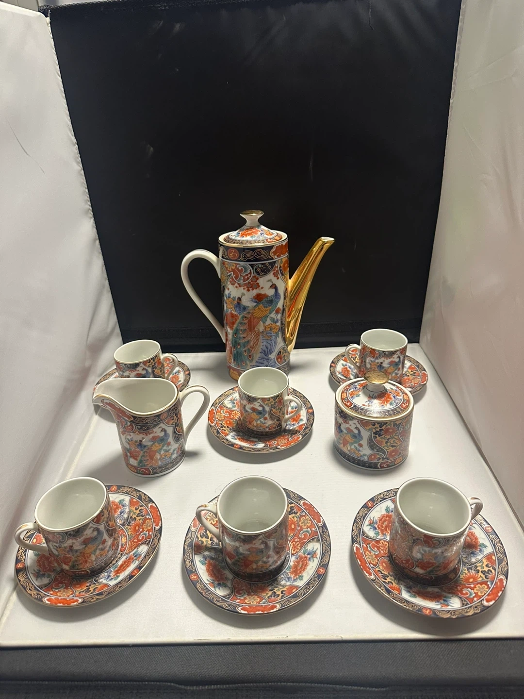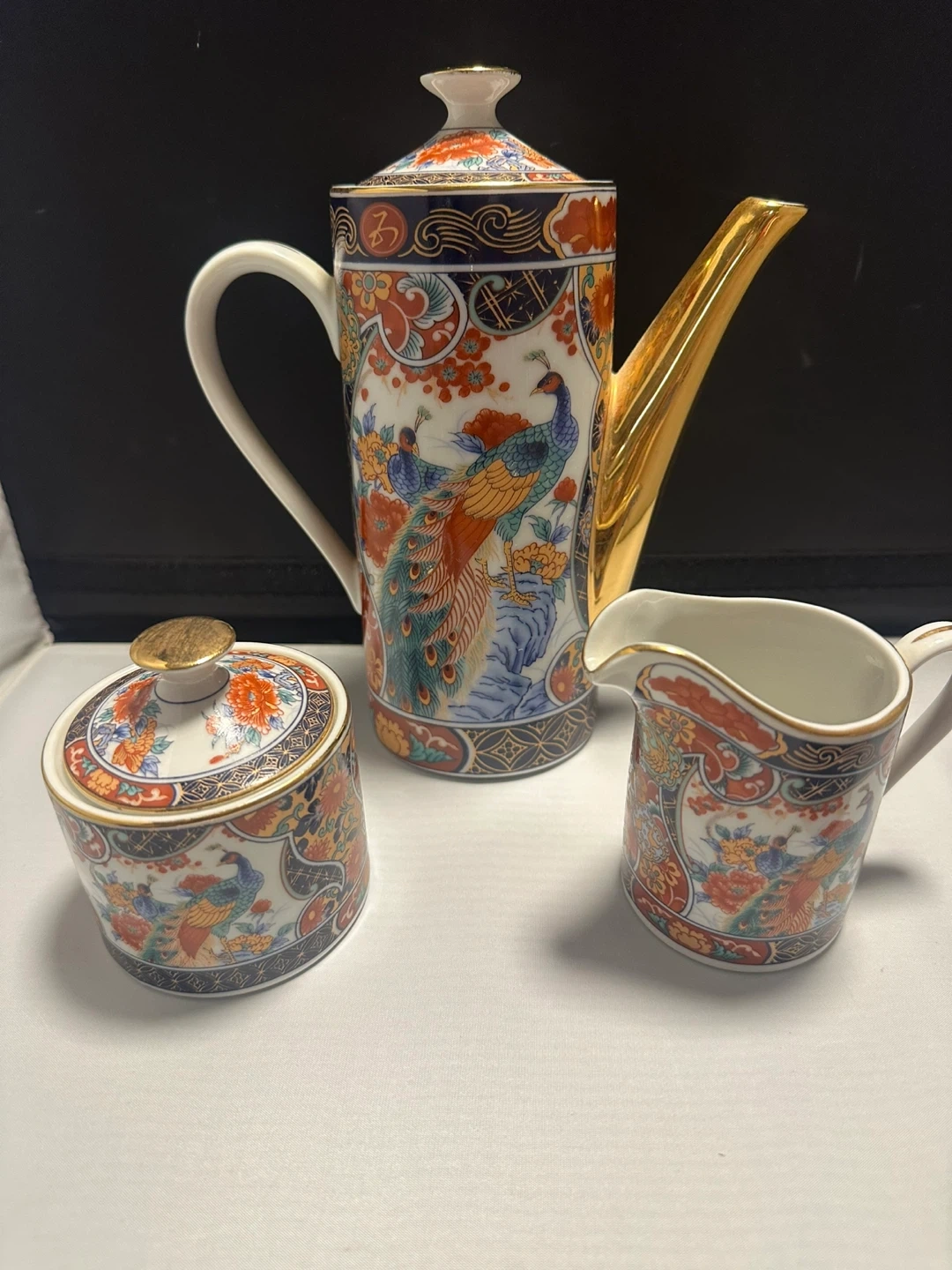 15This is a beautiful vintage Japanese tea set featuring a vibrant peacock design. The set includes a teapot, creamer, sugar bowl, and several cups with saucers. It's a stunning addition to any collection! In mint condition!