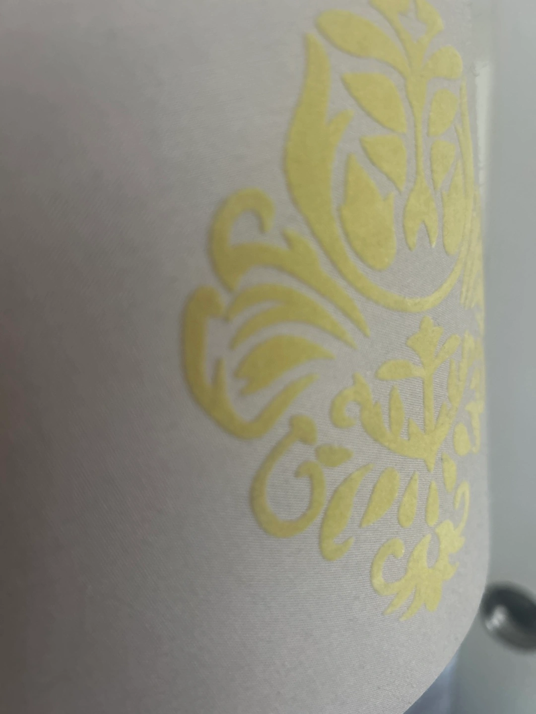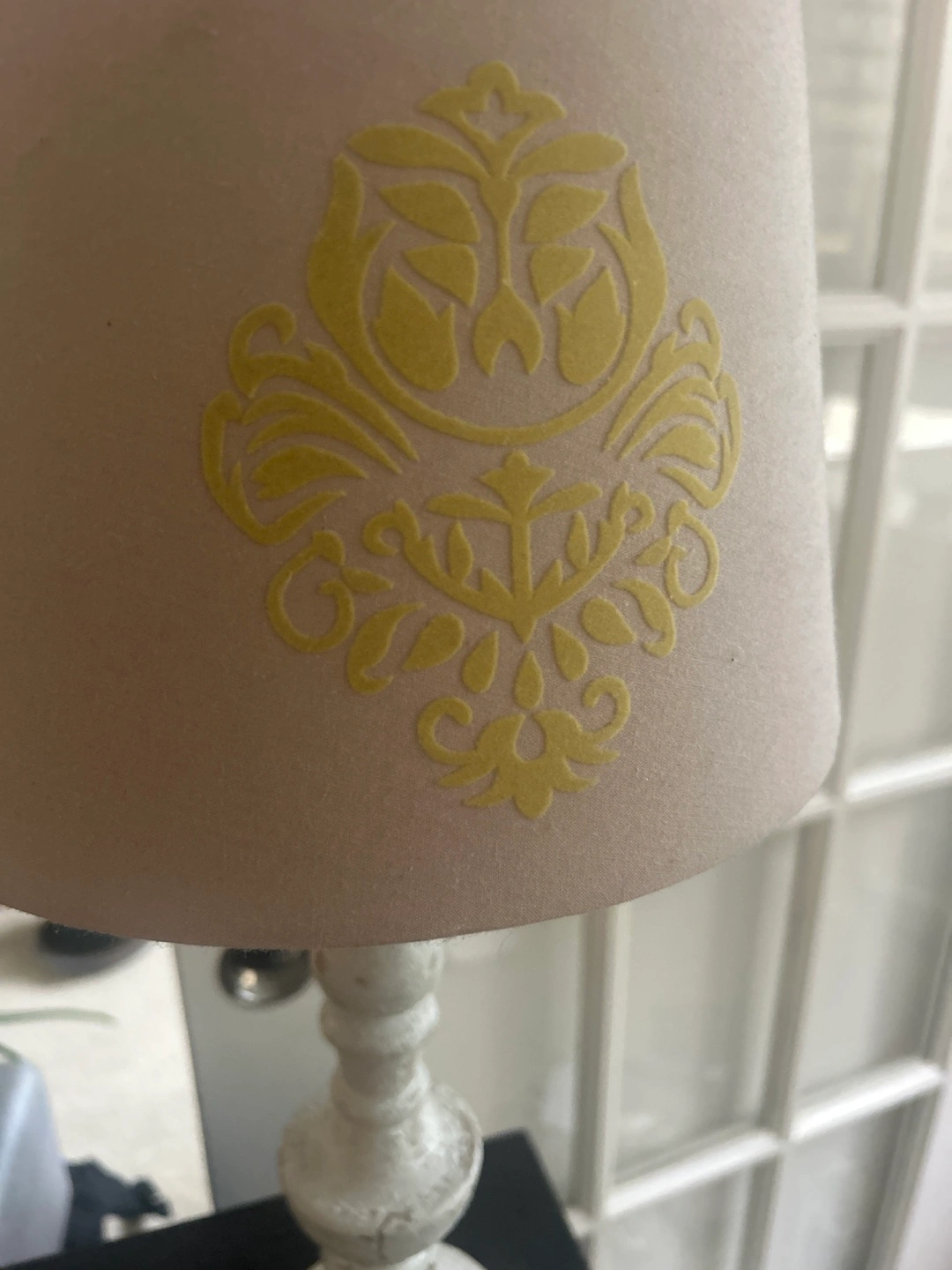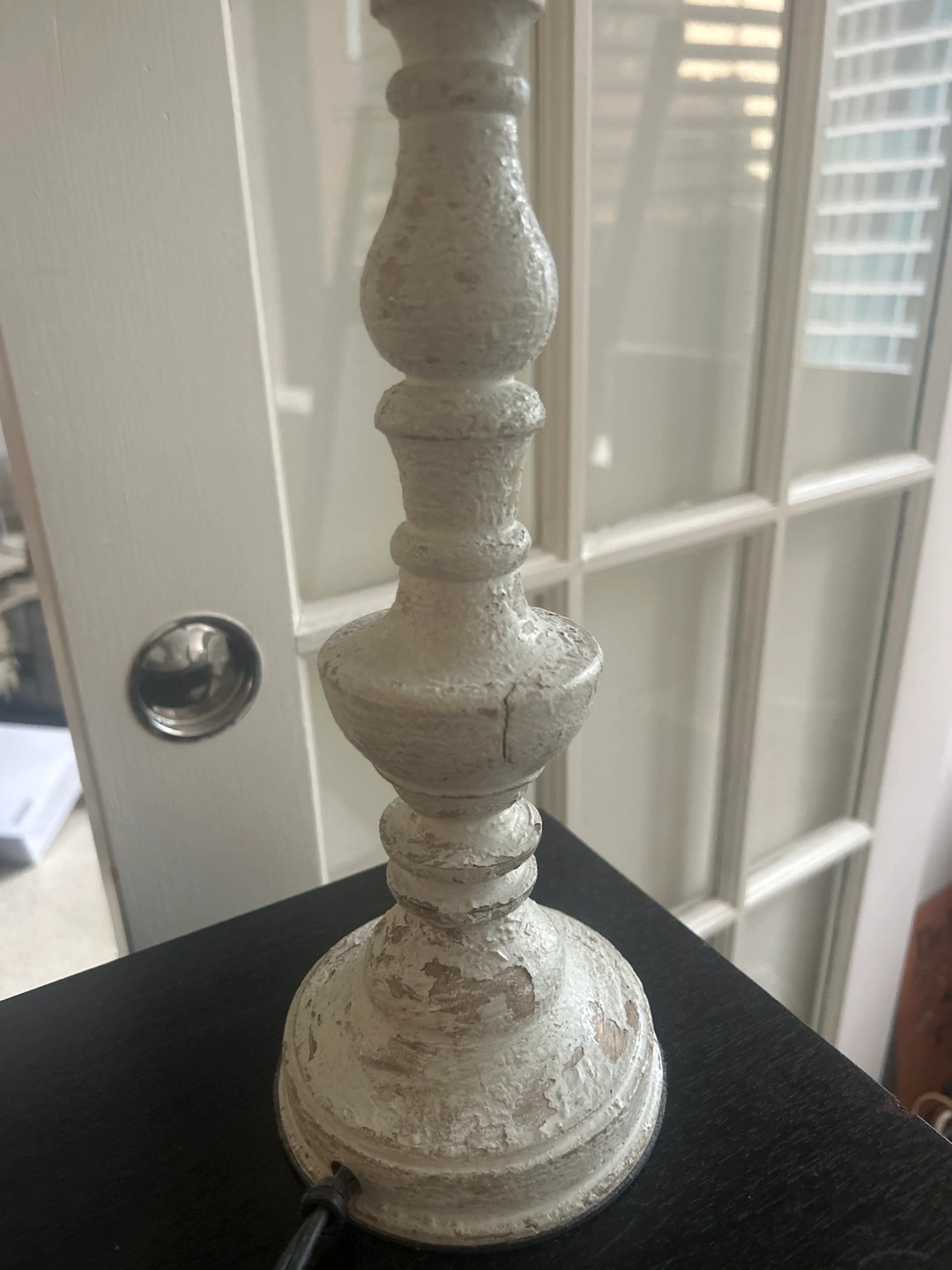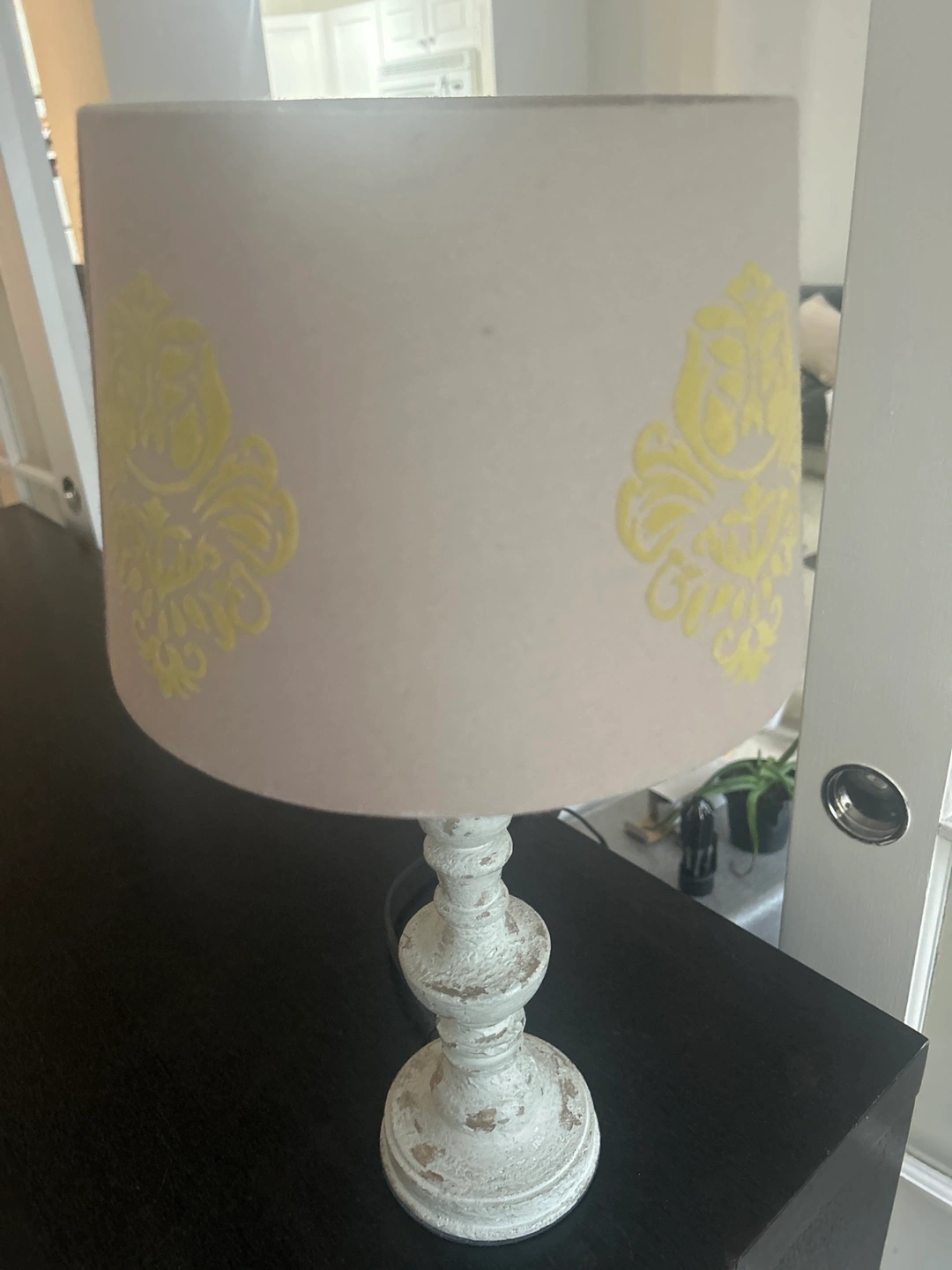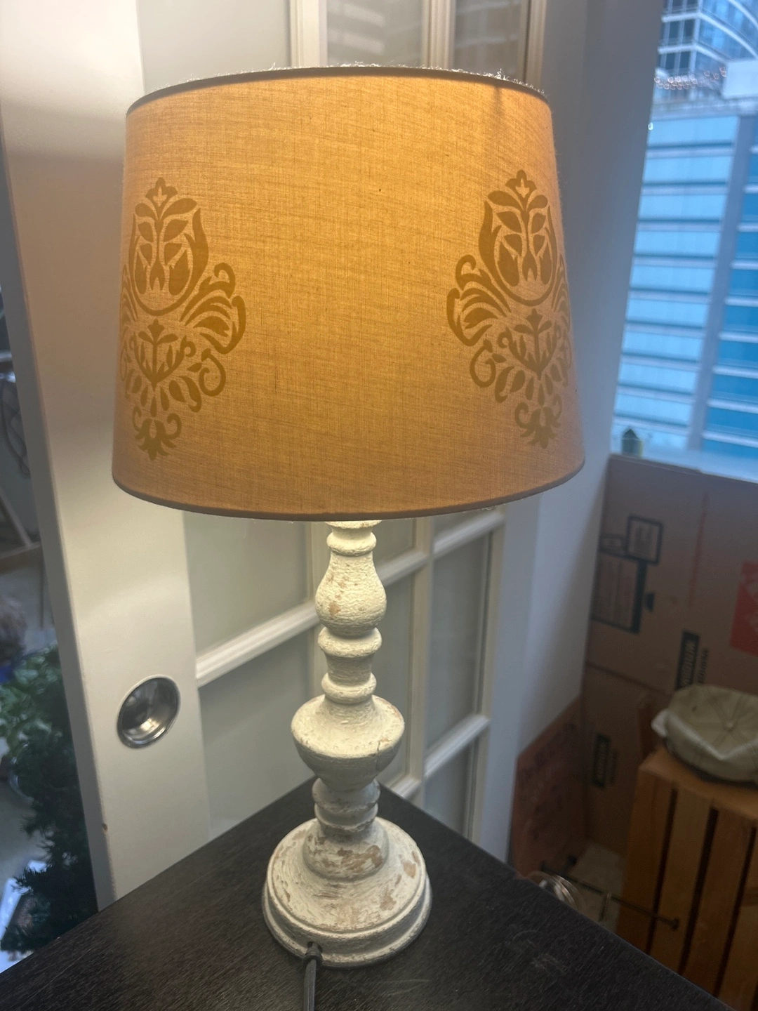 Distressed white table lamp. Features a turned wooden base and a fabric lampshade with a gold damask pattern. Great for bedside or end table.