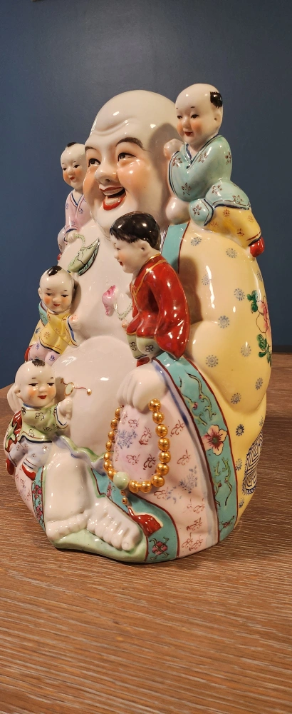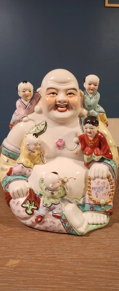 114This is a vintage Laughing Buddha figurine with children. Happy Buddha" or "Budai" is often associated with good fortune, happiness, fertility, and prosperity.