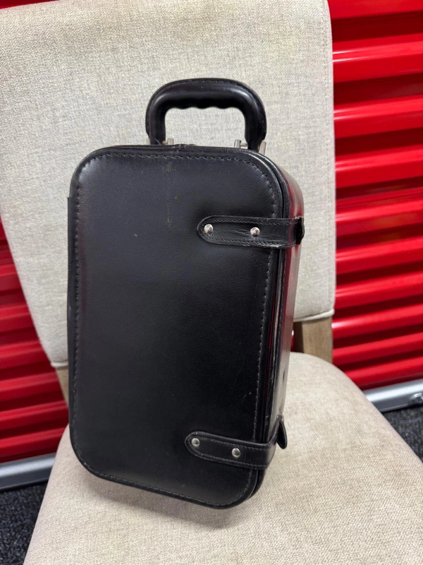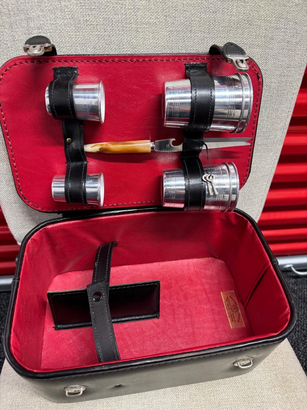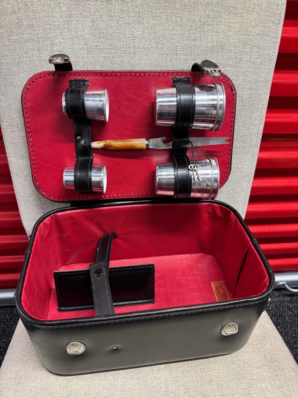 Vintage leather liquor case in black with red interior. Includes four shot glasses and a bottle opener/knife combo. Perfect for picnics or a retro bar setup!