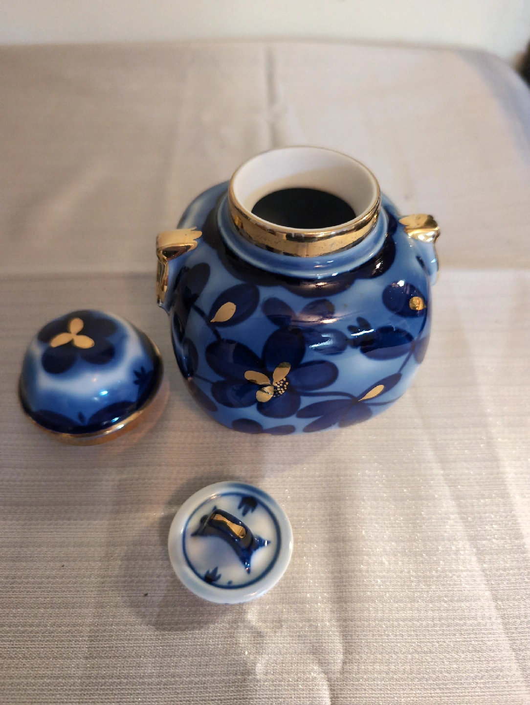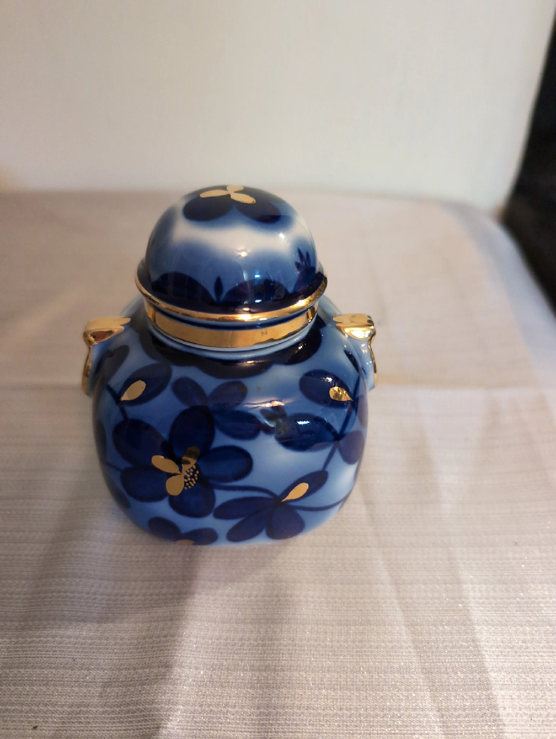 Selling a beautiful vintage Lomonosov porcelain jar. It features a lovely blue and white floral design with gold accents. This jar would be a charming addition to any home decor