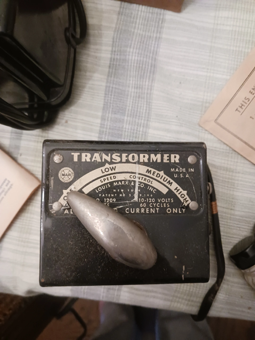 Selling a vintage transformer by Louis Marx & Co. It has speed control settings from low to medium to high. Made in the USA and designed for 110-120 volts, 60 cycles current only