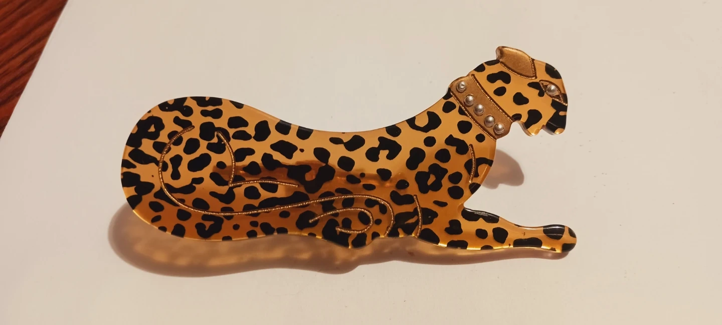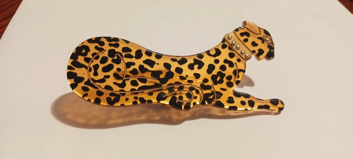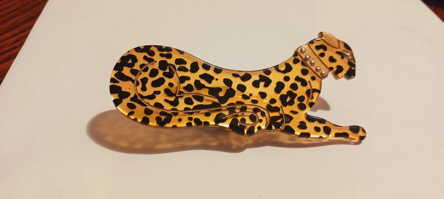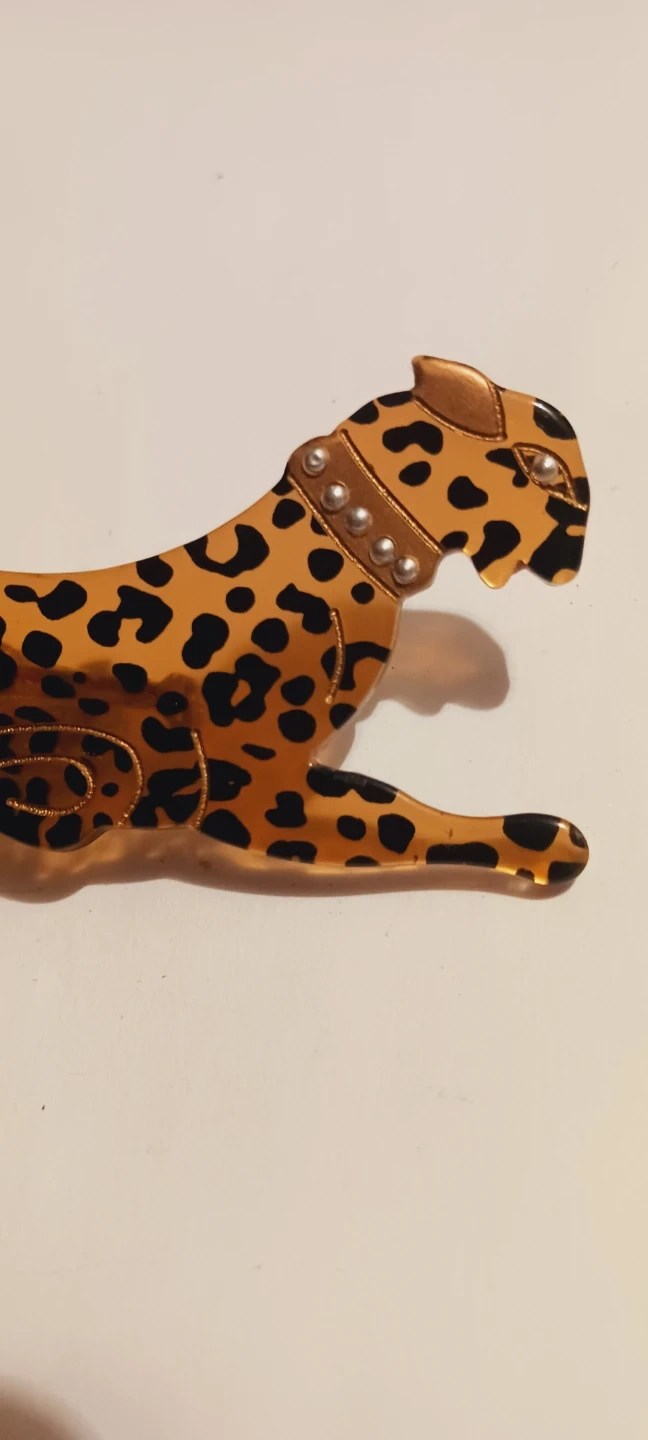 1000+Lovely vintage lucite leopard brooch! It's a figural pin in the shape of a leopard ๐. The brooch features a gold-tone finish with black spots and a pearl accented collar. It's in excellent condition and ready to add a touch of wild style to your wardrobe !! 3.5"ร2". Excellent condition. ALL MY PRICES ARE NEGOTIABLE !!