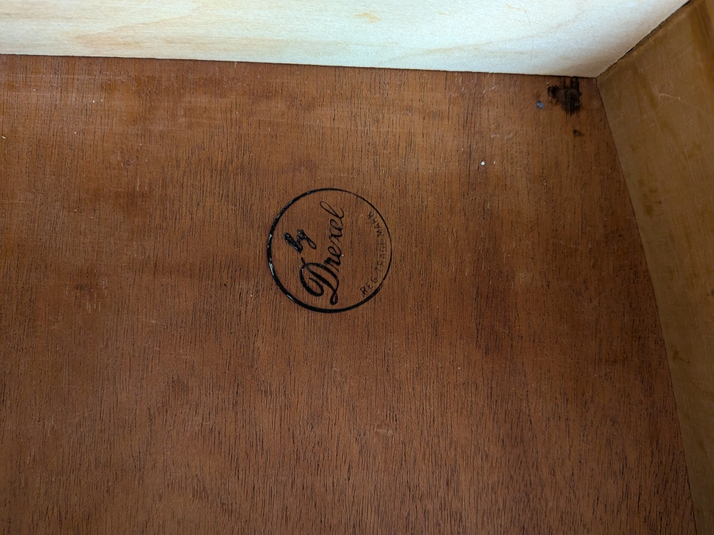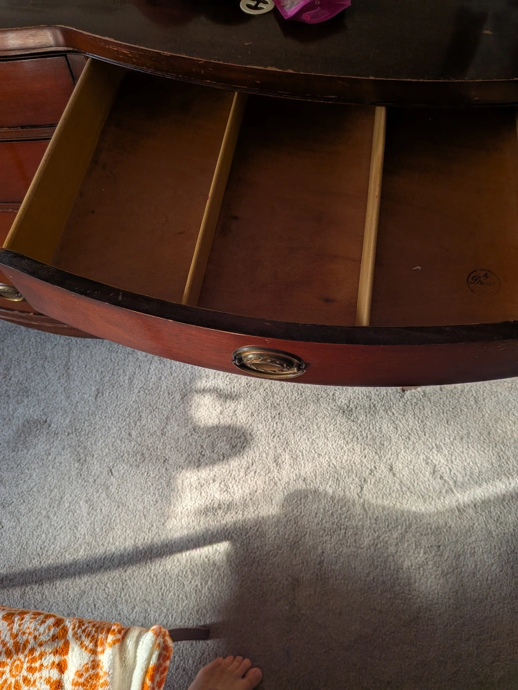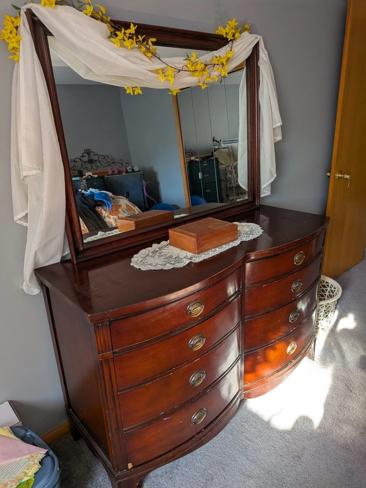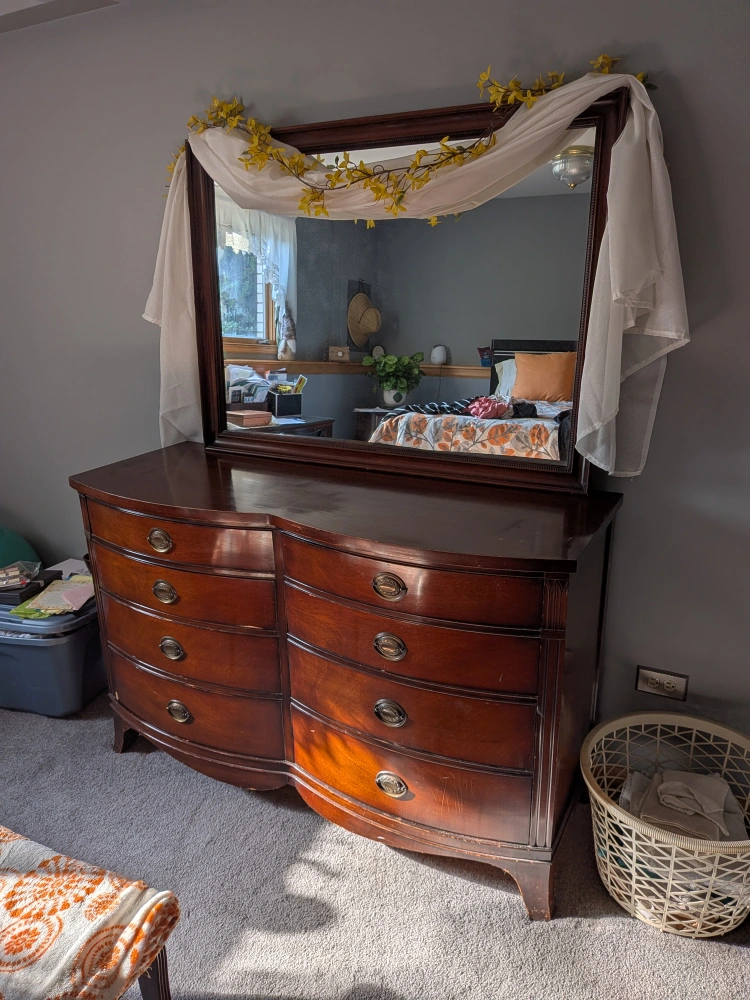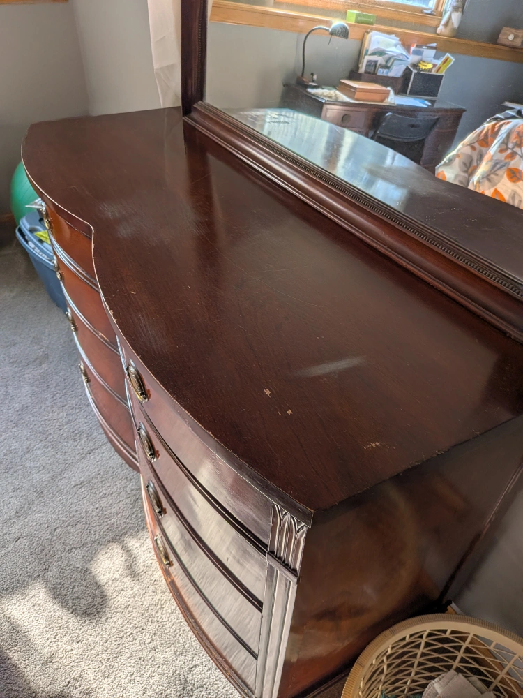 Selling a Drexel vintage mahogany dresser with a matching mirror. It features a classic design with 8 curved drawers and ornate hardware. There are some minor scratches on the top surface, as shown in the photos, but overall it's in good condition and would make a beautiful addition to any bedroom.