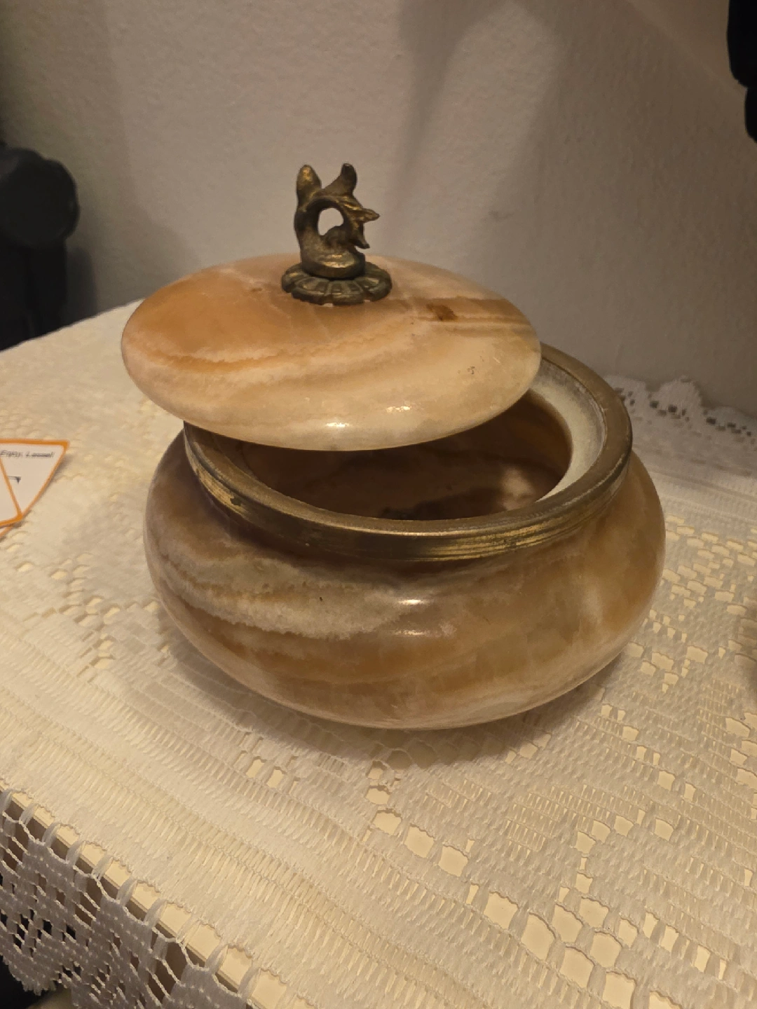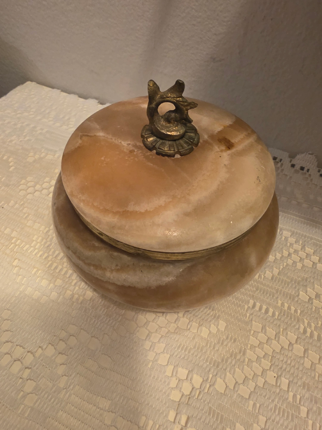 Selling a vintage marble trinket box. It has a unique design with a bird-shaped handle on the lid. It's in good condition and perfect for storing small items or as a decorative piece