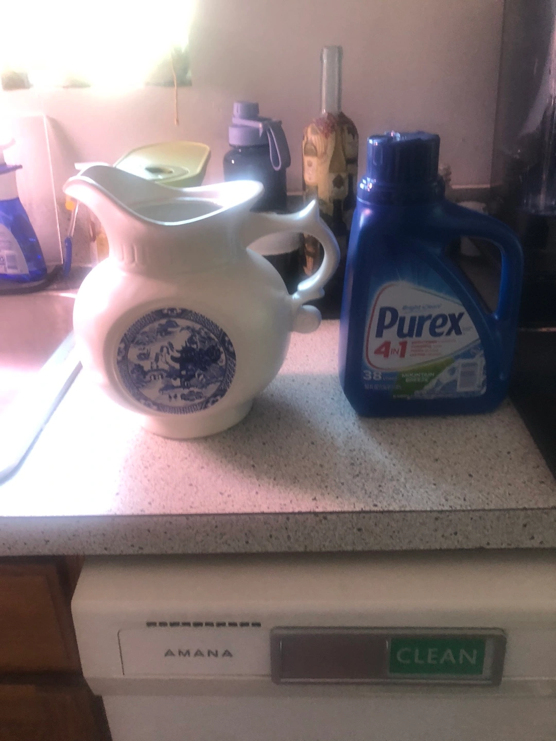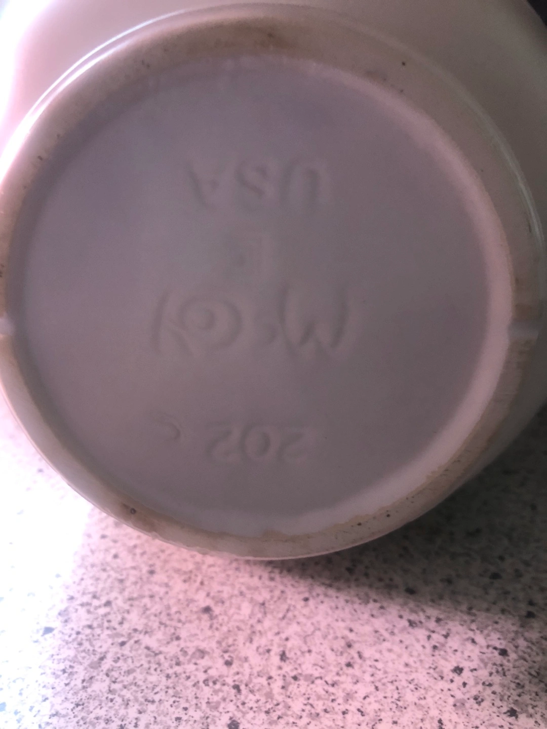 Selling a vintage McCoy pitcher. It's white with a beautiful blue design. The bottom is marked with 'McCoy USA' and the number '202'. A lovely addition to any collection or kitchen!