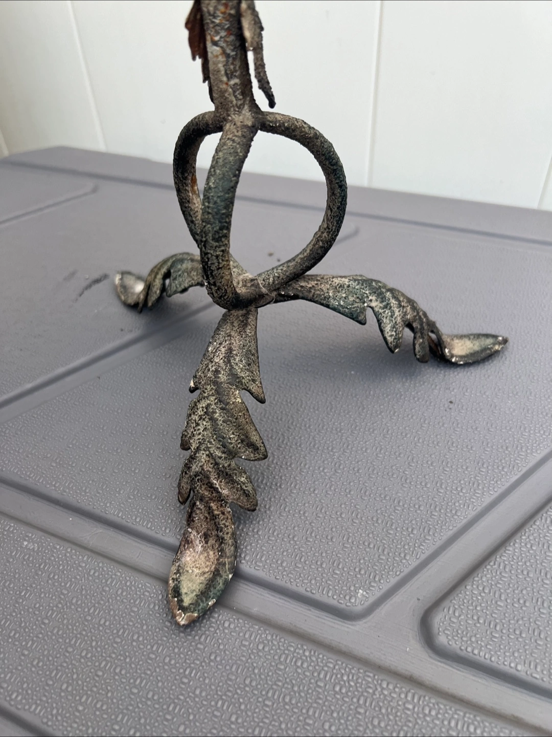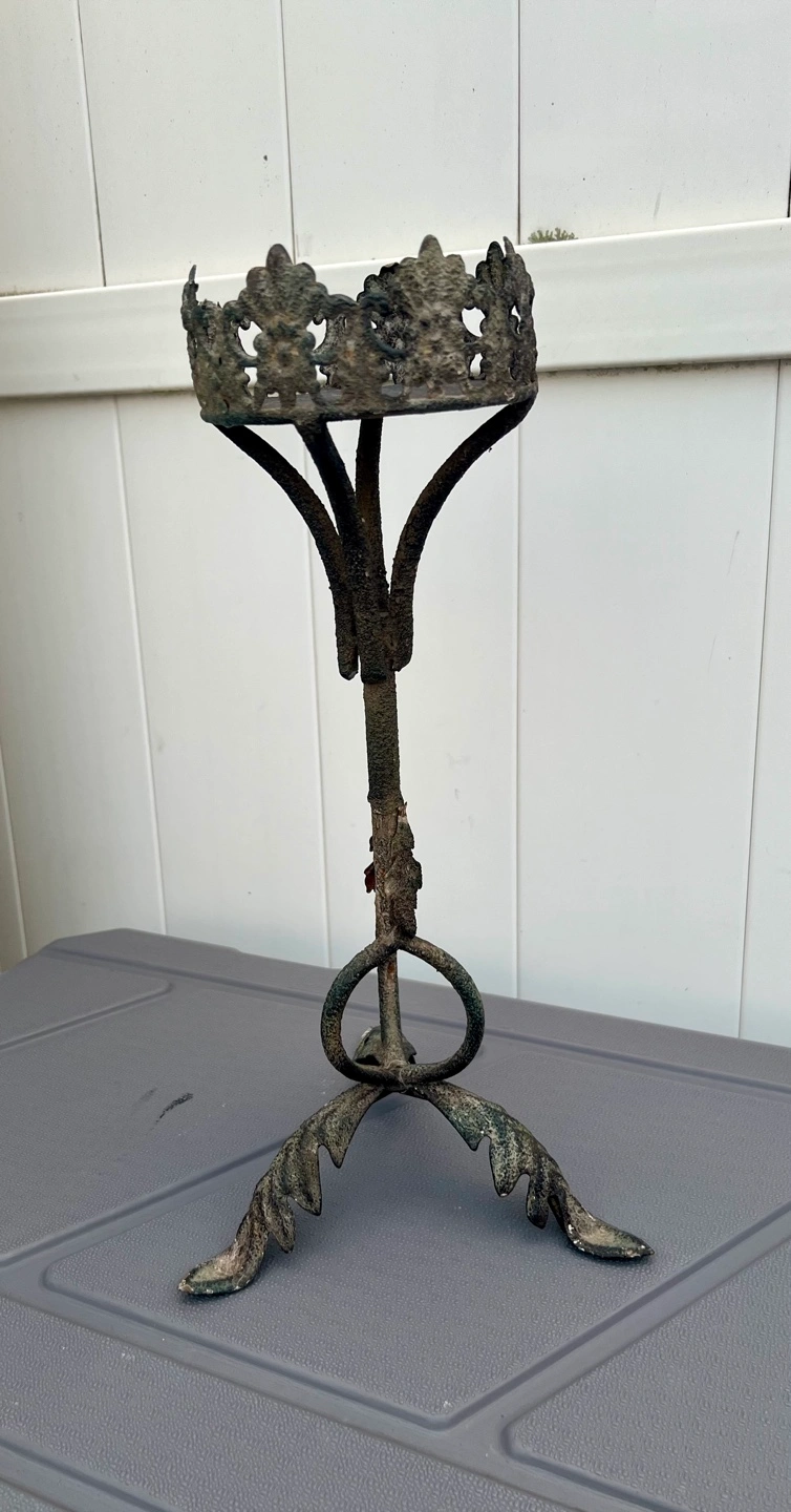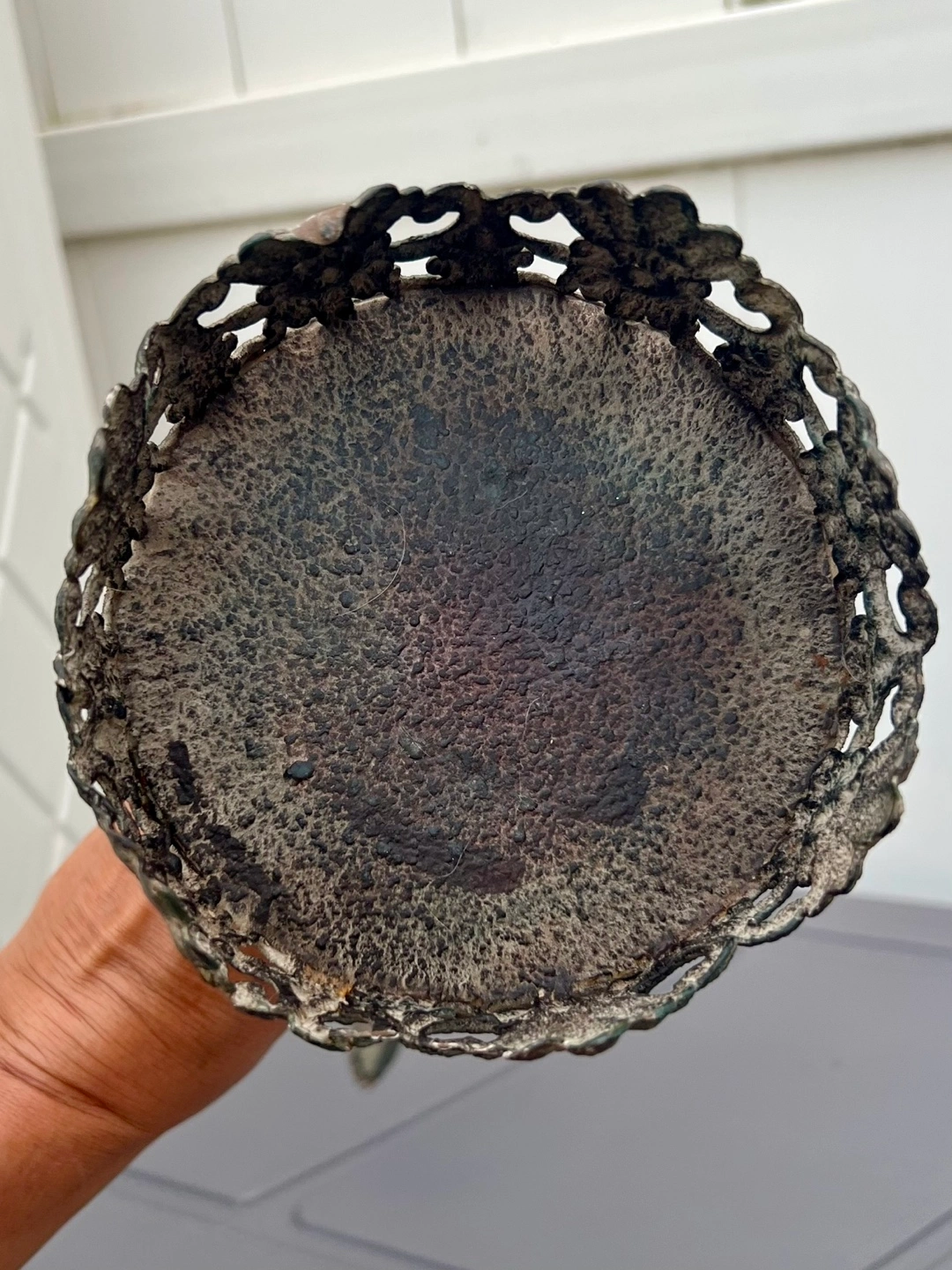 Selling a vintage metal candle holder. It has a unique, ornate design and a sturdy base. Perfect for adding a touch of old-world charm to your home decor