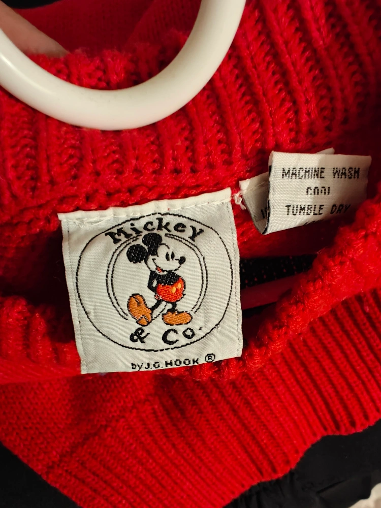 Red knit sweater featuring Donald Duck. Crew neck. Long sleeves. Classic Disney design. By J.G. Hook.