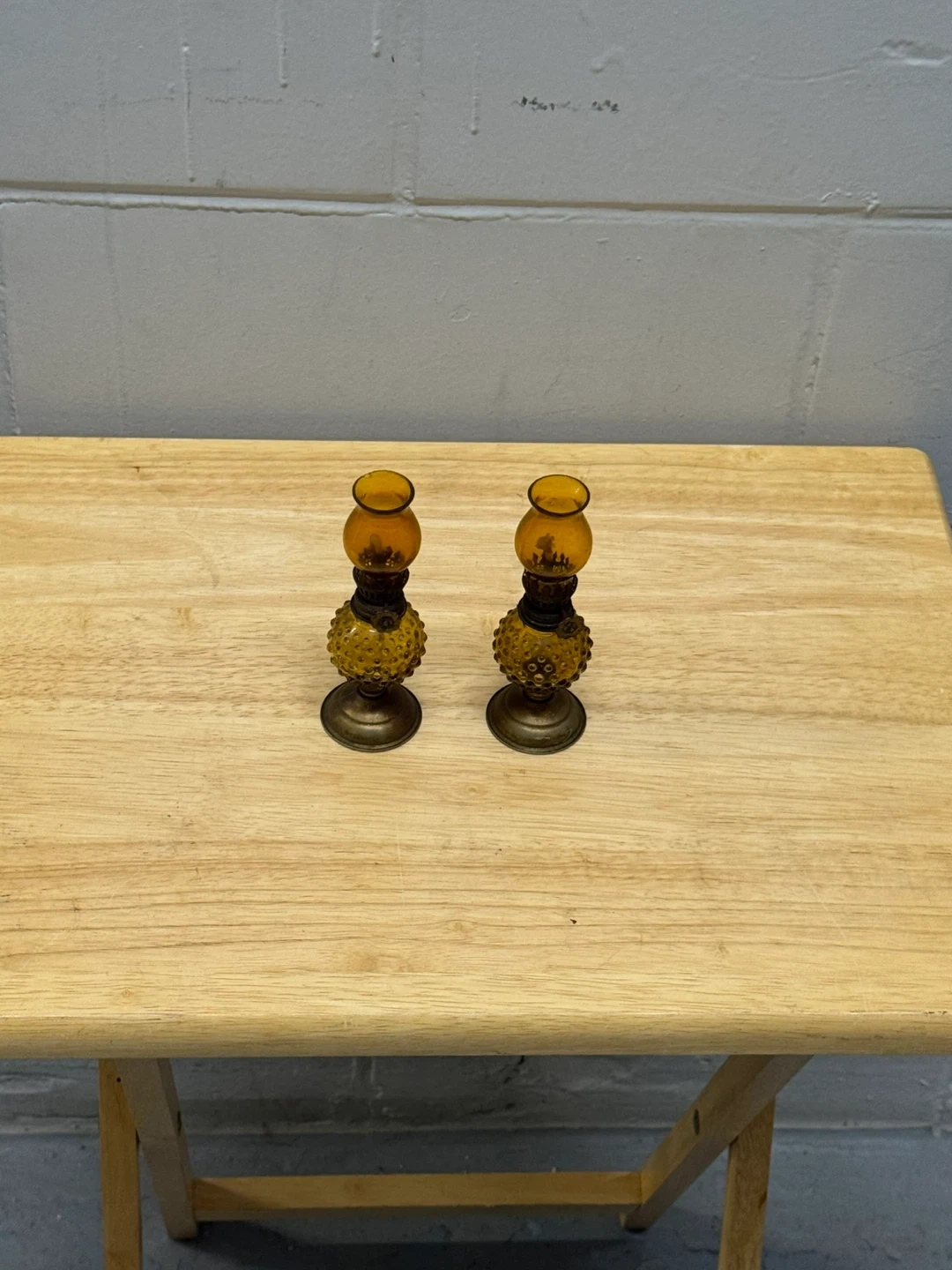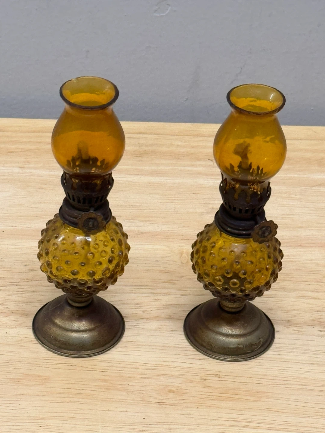 Here's a pair of vintage miniature oil lamps! They have a unique hobnail design on the glass globes. These little lamps would make a charming addition to any collection or decor