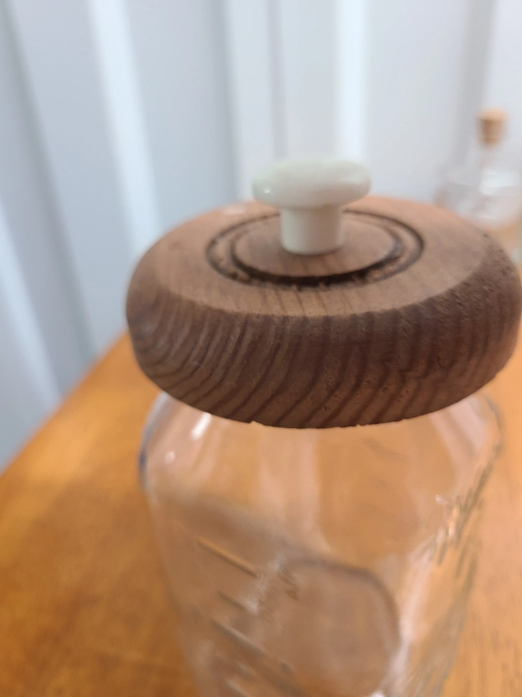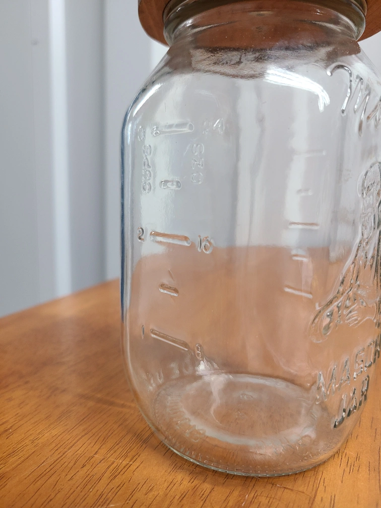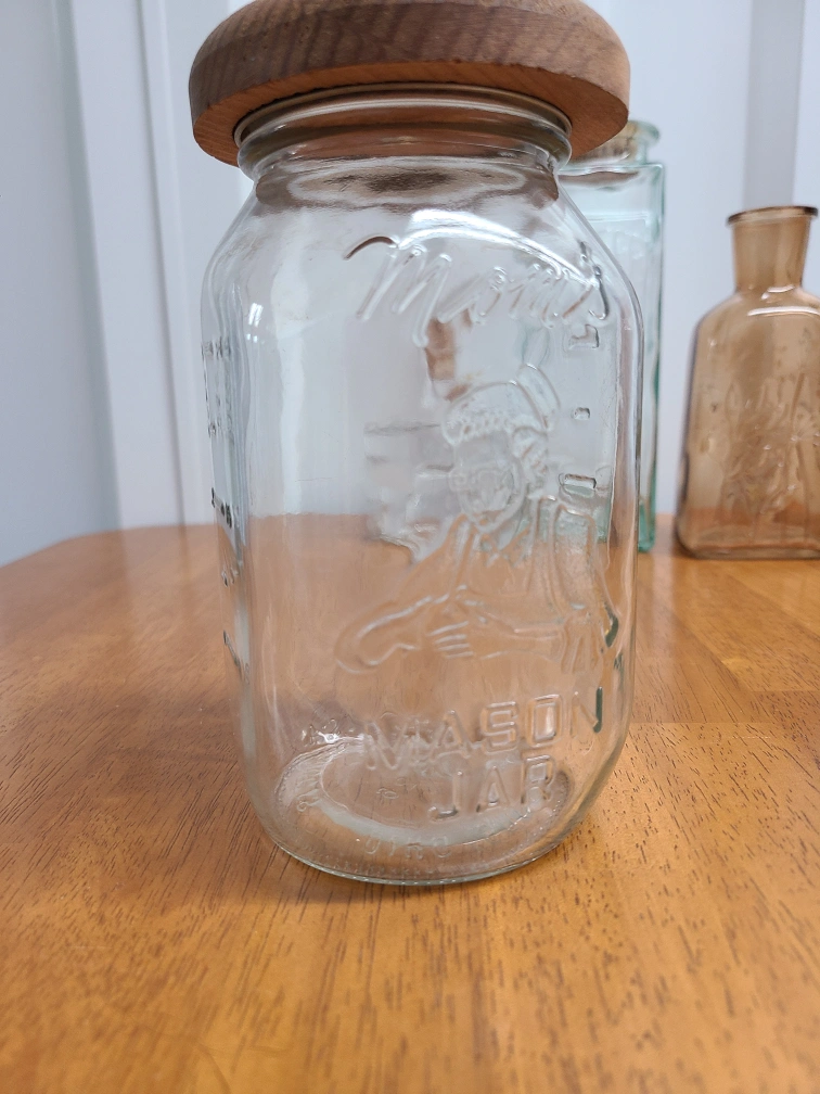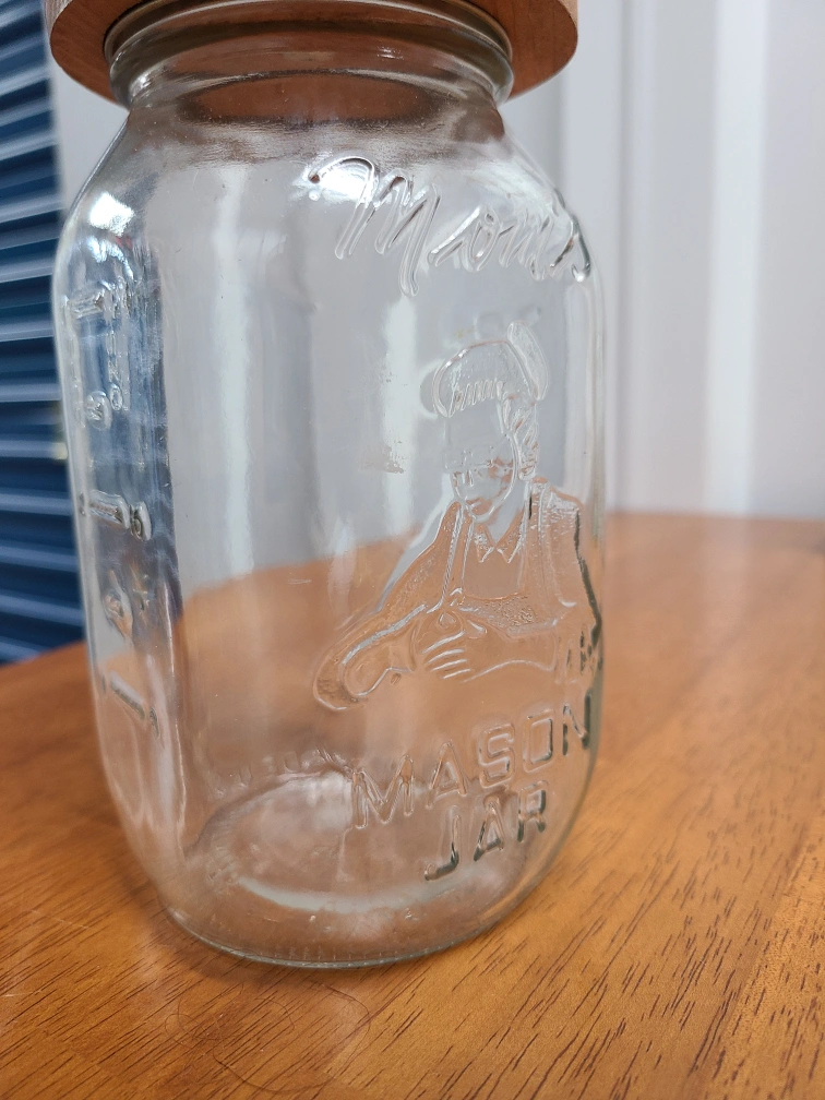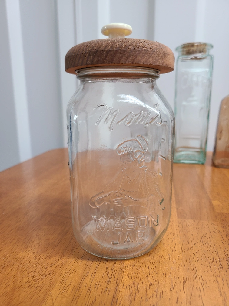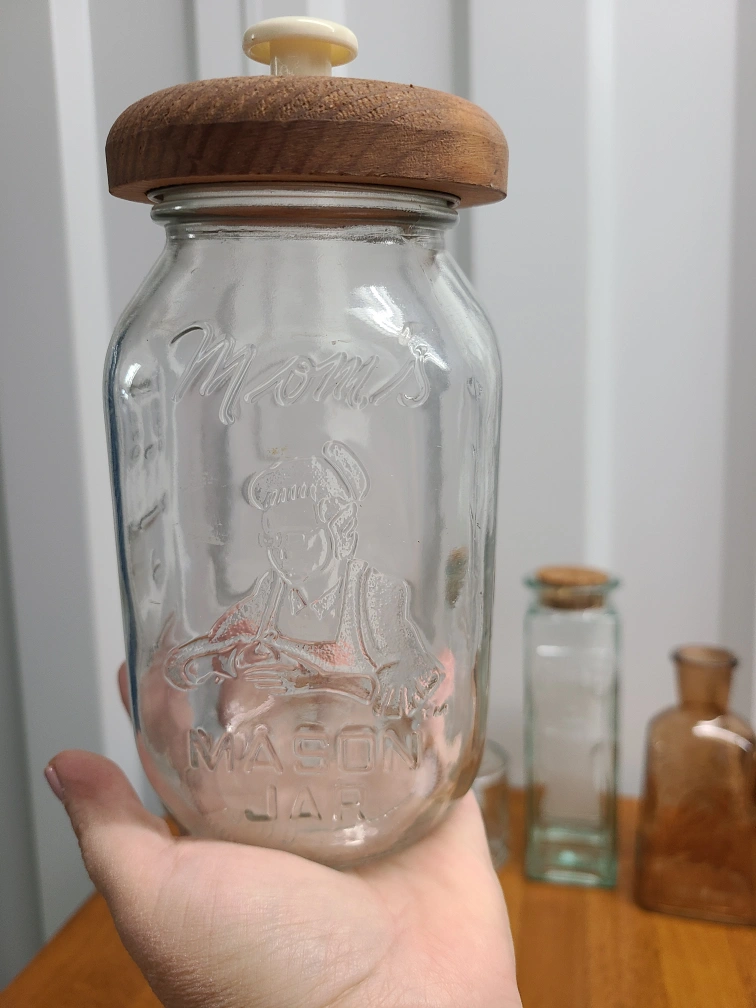 Selling a vintage Mom's Mason Jar. It has a unique wooden lid with a white knob. The glass jar features embossed markings for measurements in cups and quarts. Great for adding a touch of nostalgia to your kitchen!