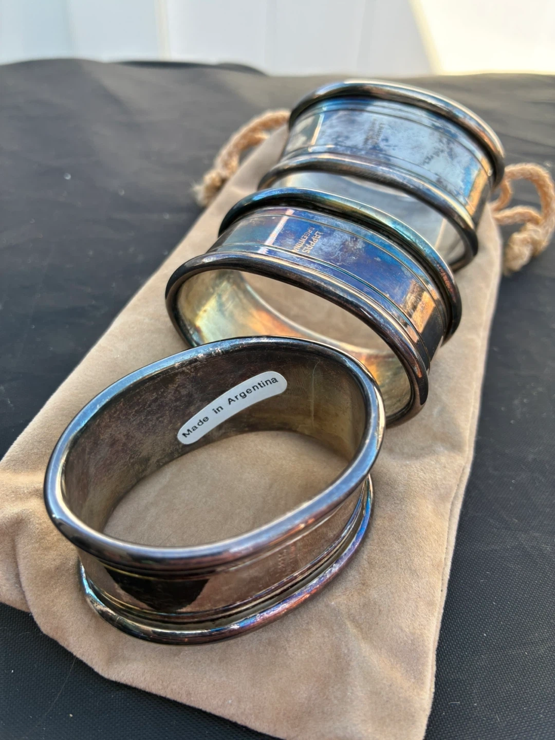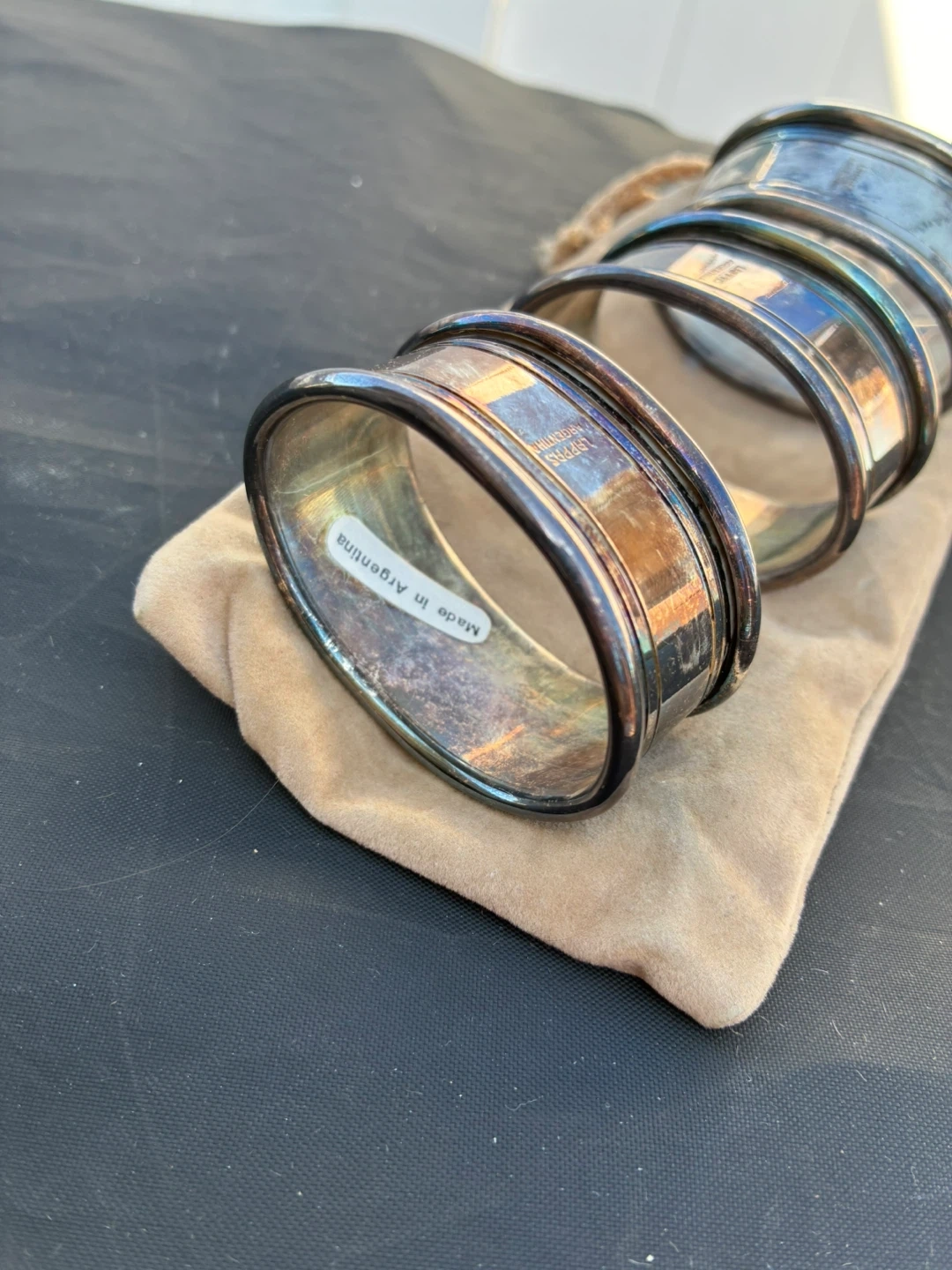 Vintage Napkin Rings - Made in Argentina Selling a set of vintage napkin rings. They are marked as 'Made in Argentina' on a sticker. They show some signs of wear and use, but are still in good condition. Comes with the original pouch Pick up in Norridge Price $ 10
