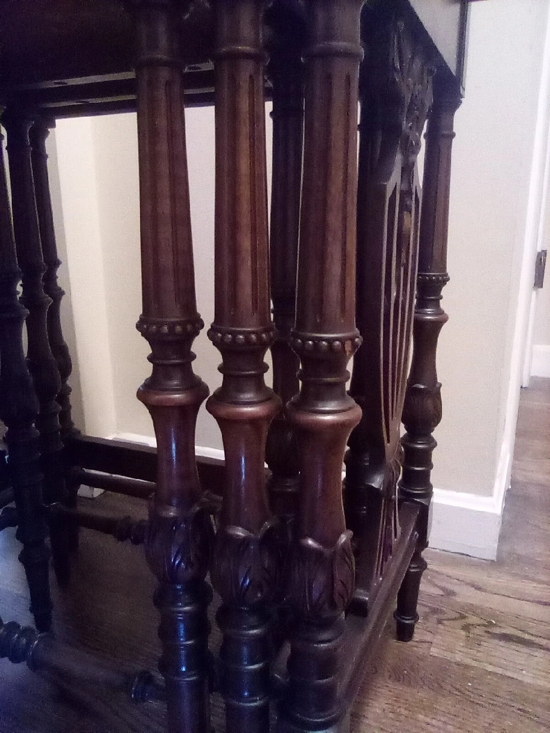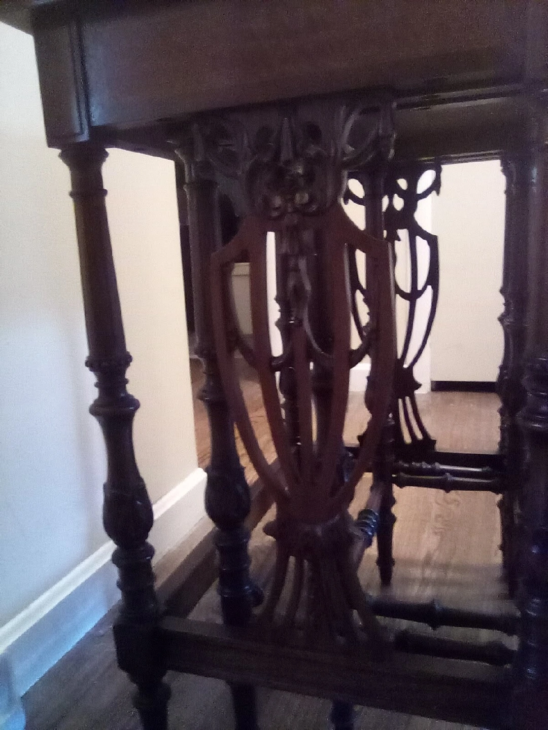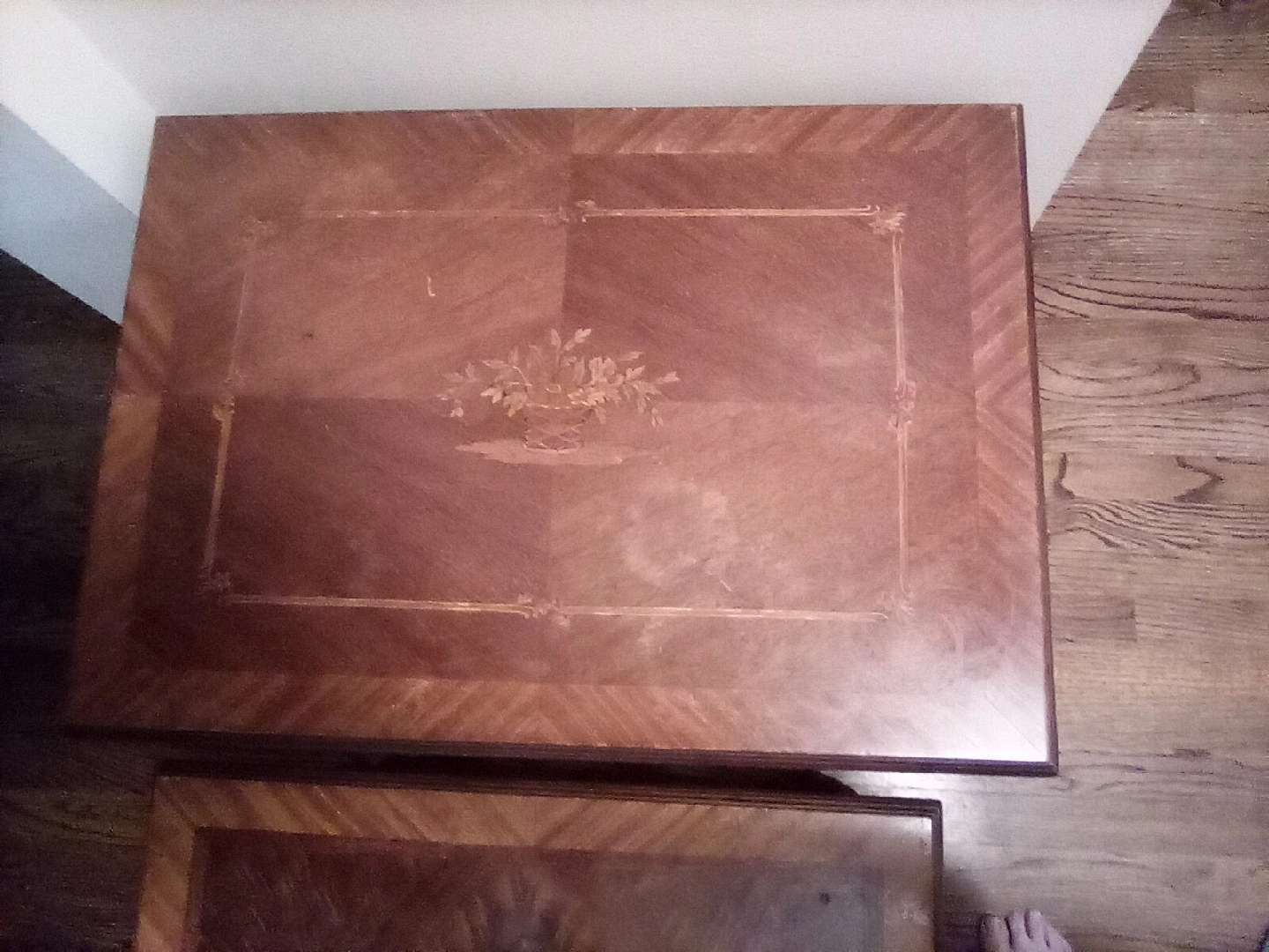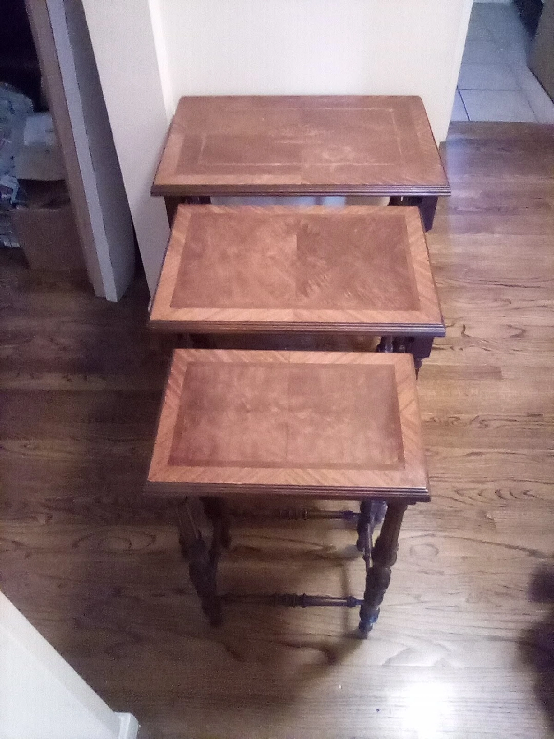 Set of three vintage (early 1900s) nesting tables. They are oak, with turned legs and decorative sides. Each table has inlay design, and top table has a marquetry basket design. Nice to save space, but have a table on hand when you need it.
