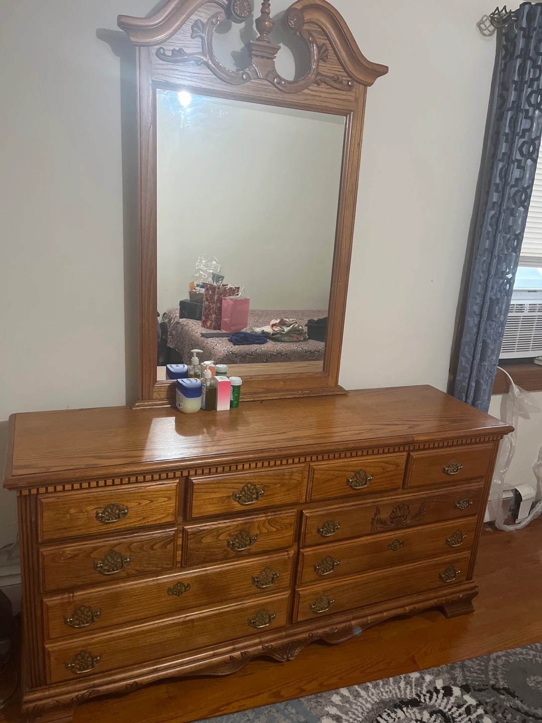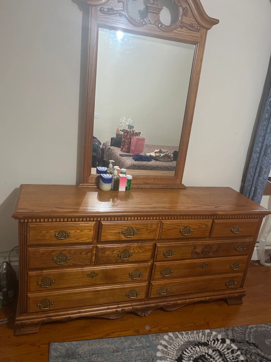 16Selling a beautiful vintage oak dresser with an attached mirror. It features a classic design with ornate details on the mirror frame and drawer pulls. The dresser offers ample storage with its multiple drawers. Perfect for adding a touch of elegance to any bedroom!