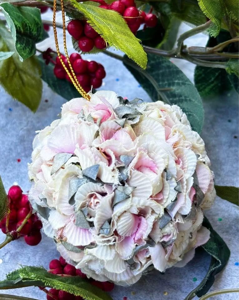 15Like New / Never Used. Handcrafted and intricately designed ornament adorned with pink, white, green botanicals & floral petal fabric. Gold braided string for hanging directly on tree or with a hook. 3.25" W x 3.25” H. Let me know if you're interested!