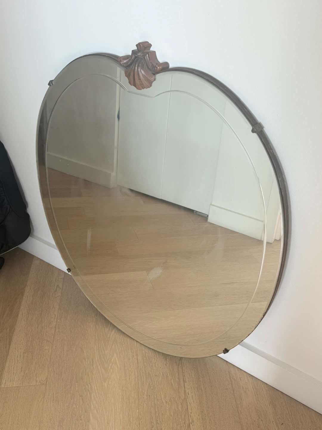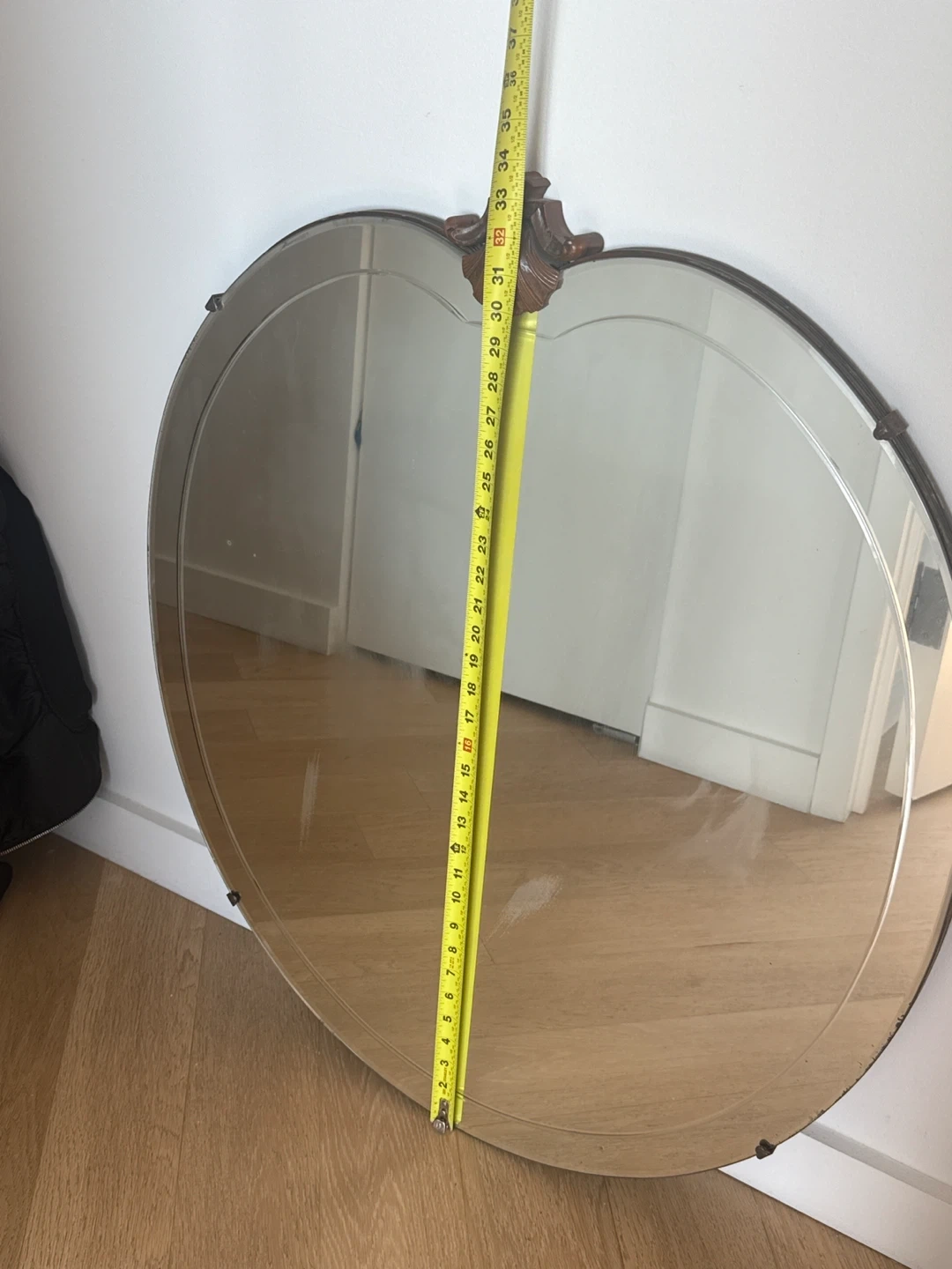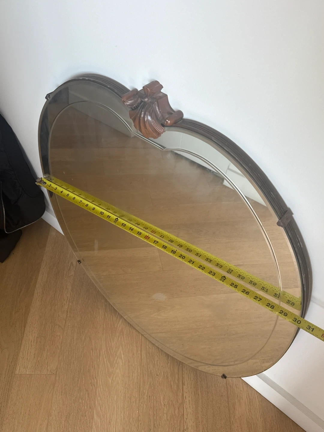 Selling a vintage oval mirror with a beveled edge and a decorative shell detail at the top. It measures approximately 34 inches in height and 30 inches in width. It's in good condition.