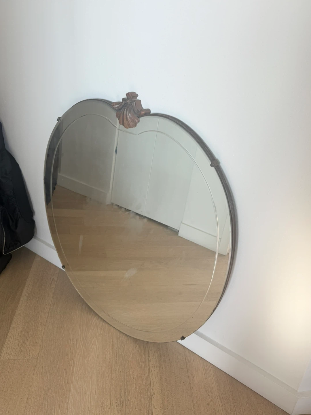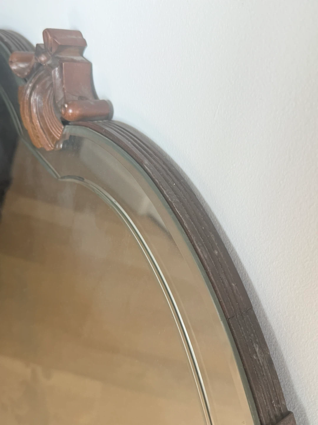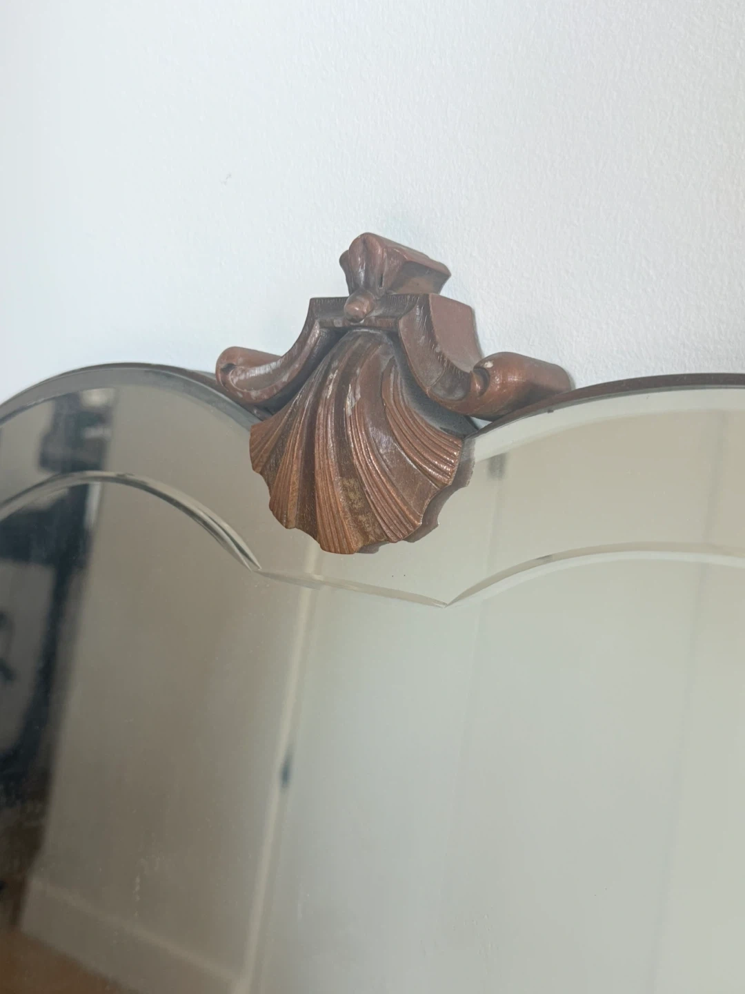 Selling a vintage oval mirror with a beveled edge and a decorative shell detail at the top. It measures approximately 34 inches in height and 30 inches in width. It's in good condition.