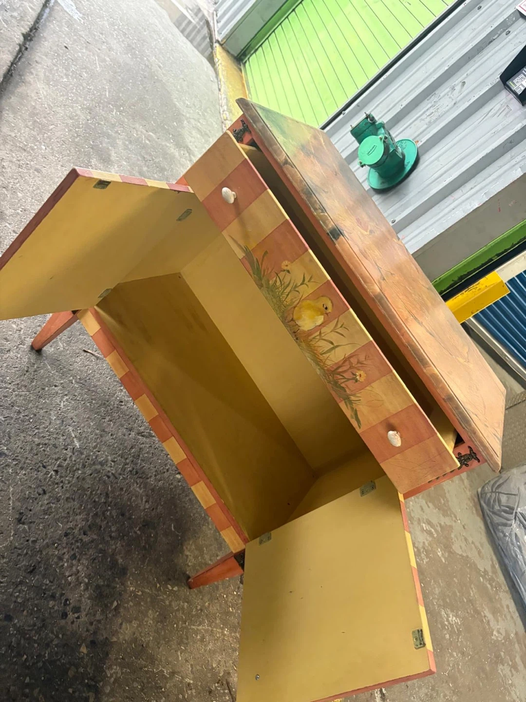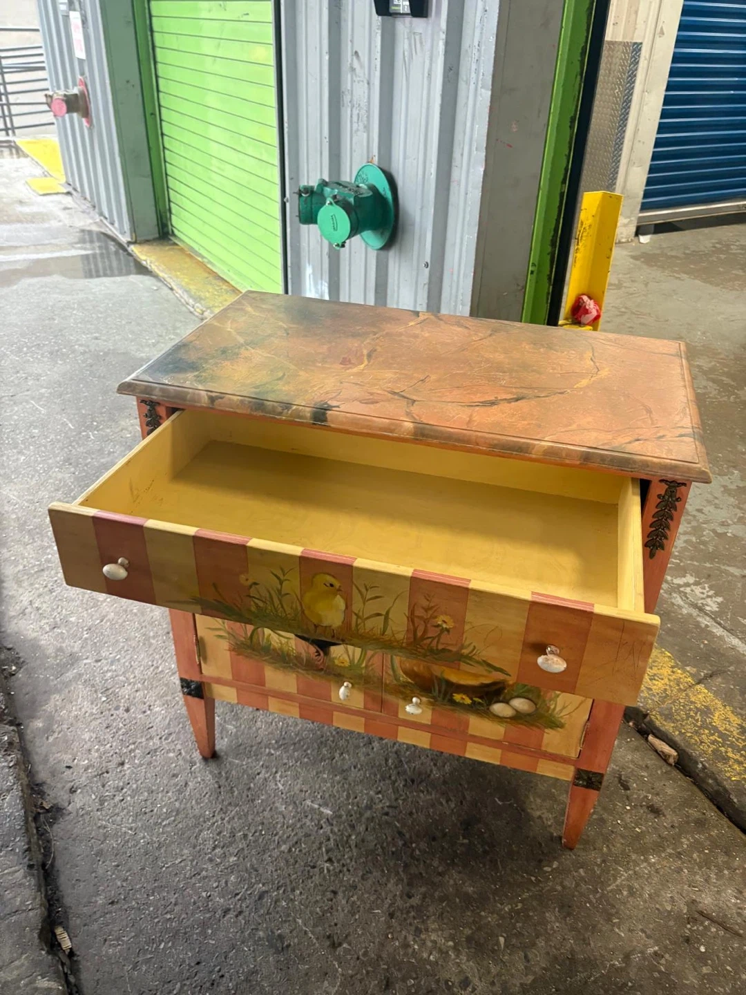 Selling a unique vintage accent cabinet! It features a painted design with chickens and chicks, adding a whimsical touch to any room. The cabinet has a drawer and a cabinet door for storage. It's in good condition and ready for a new home