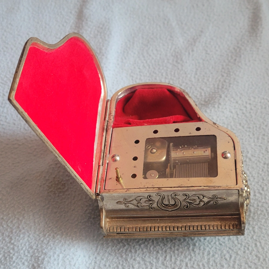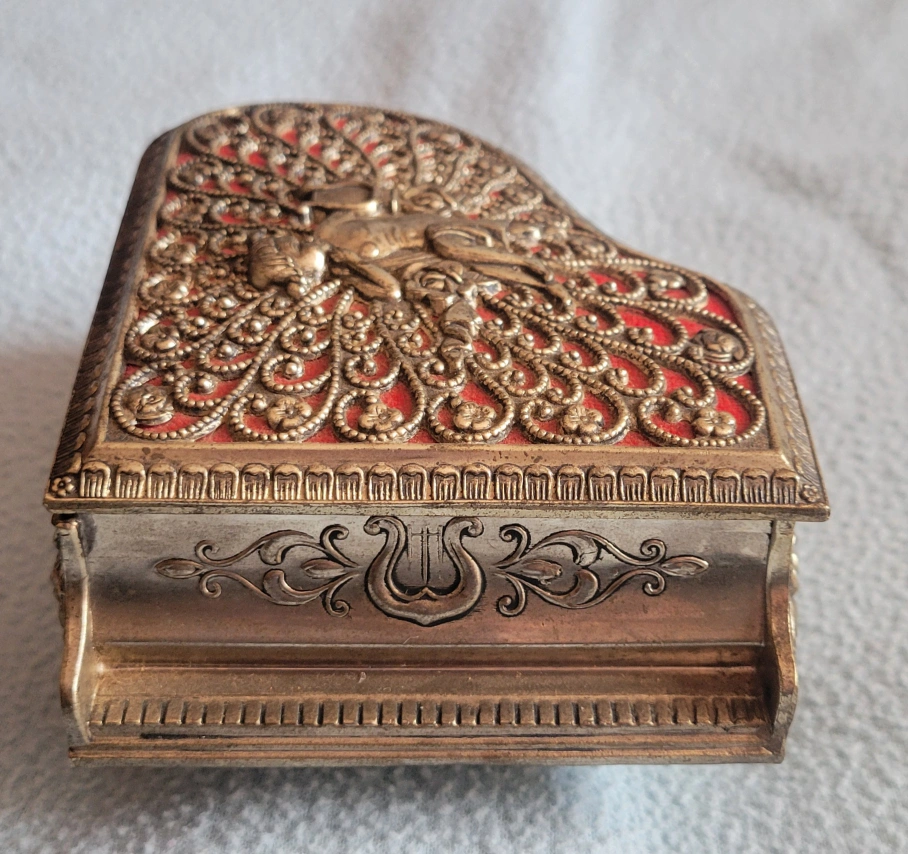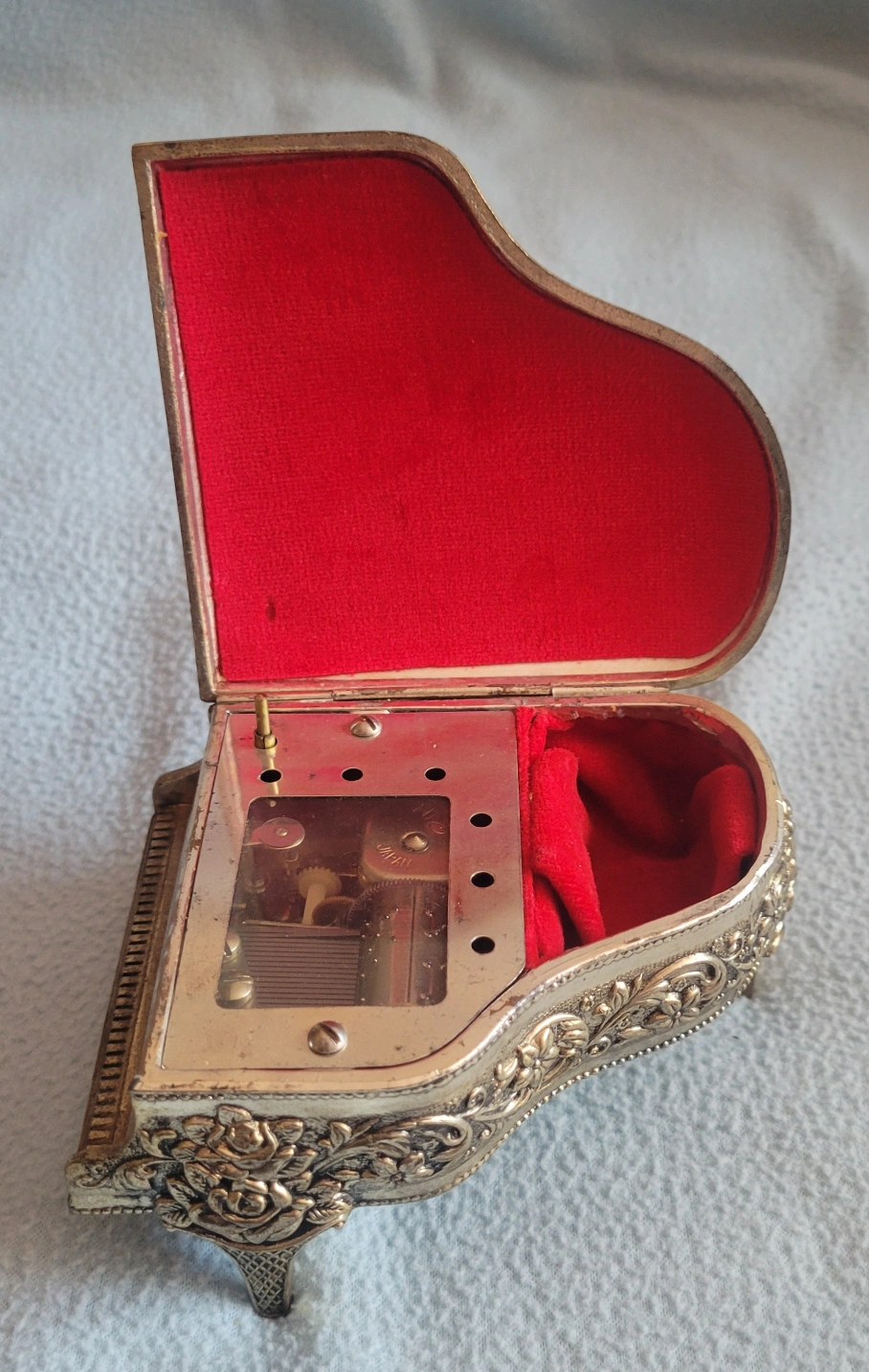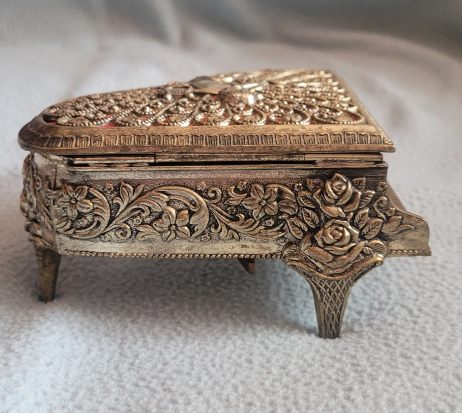 Selling a vintage piano shaped musical trinket box. It has a red interior and a beautiful exterior with intricate designs. Perfect for storing small jewelry or other keepsakes! It works!
