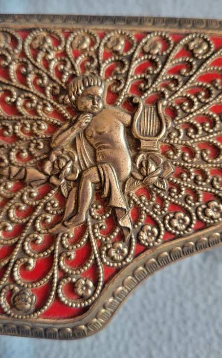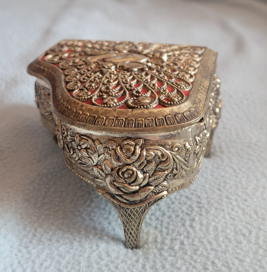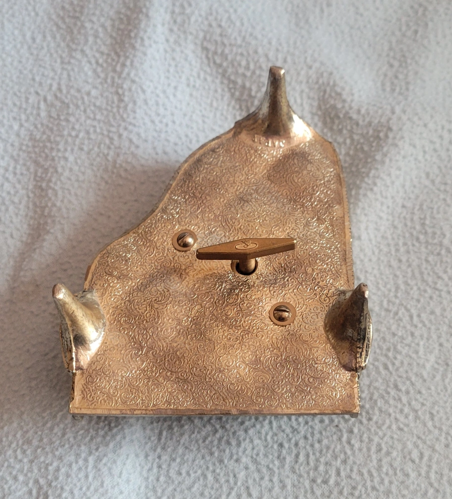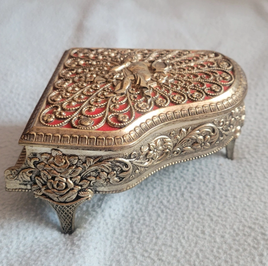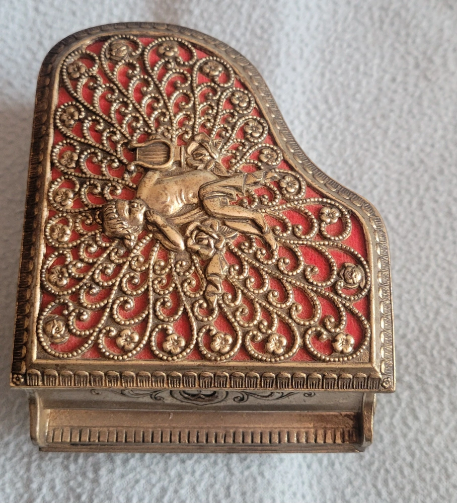 Selling a vintage piano shaped musical trinket box. It has a red interior and a beautiful exterior with intricate designs. Perfect for storing small jewelry or other keepsakes! It works!