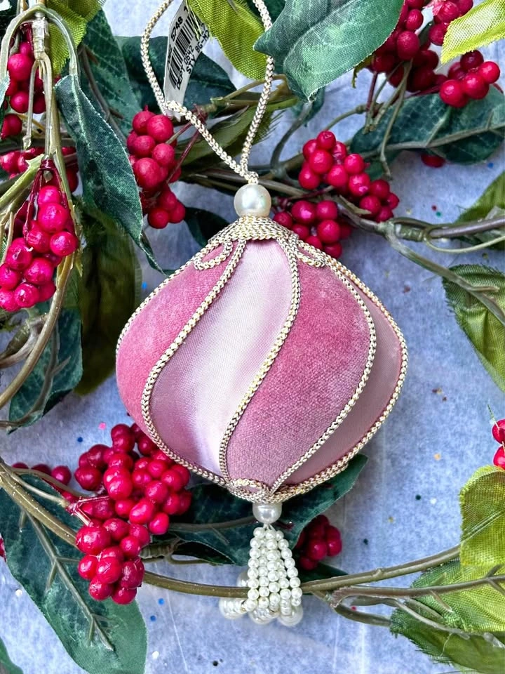 15Handcrafted and intricately designed ornament wrapped in 2 tones of pink velvet, swirled with braided gold fabric, and dangling pearls & beads. Gold braided string for hanging directly on tree or with a hook. Bring grandeur, elegance, and sophistication to your holiday decorating. Mix with other heirloom ornaments for an added layer of decadence and shine. Use hooks, ribbon, or string to dangle this beautiful ornament from the branches of your tree. 3.25" W x 5.25” H. Let me know if you're interested!