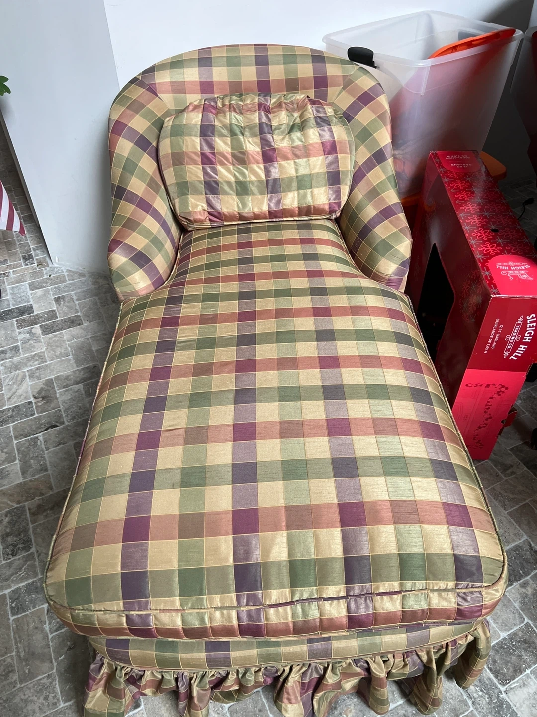 0Selling a vintage chaise lounge chair with a unique plaid pattern! It's in great condition and would be a great addition to any room. The chair features a comfortable cushion and a stylish ruffled skirt around the base. Perfect for relaxing and adding a touch of vintage charm to your home