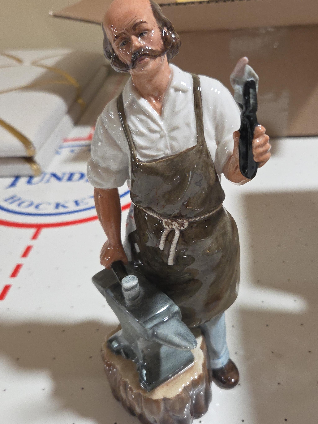 Selling a vintage porcelain figurine of a blacksmith. It's a detailed piece with the blacksmith holding a tool and standing next to an anvil. A unique addition to any collection!