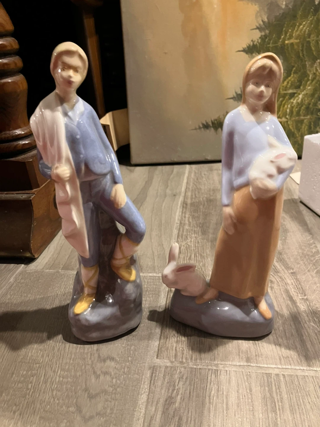 Here are two vintage porcelain figurines. One is a boy figurine and the other is a girl figurine with a rabbit. They are in good condition!