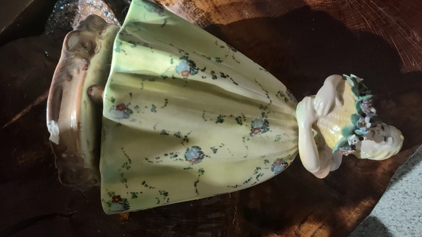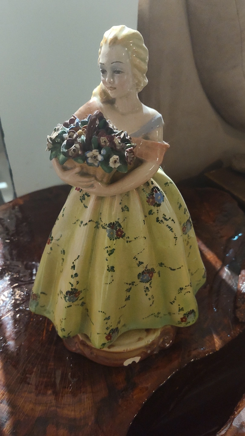 52A vintage porcelain figurine of a woman. Dressed in a long yellow dress. She is holding a basket of flowers. Placing this on your shelf can bring a sense of peace into your space. One small chip on base (as shown in picture).