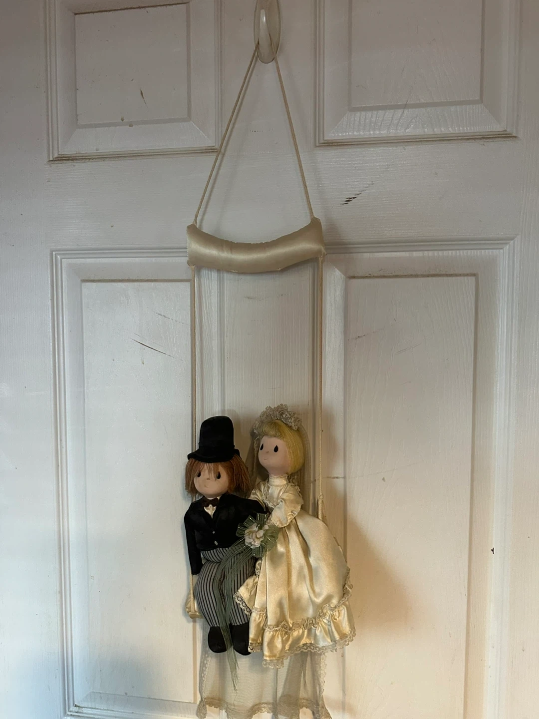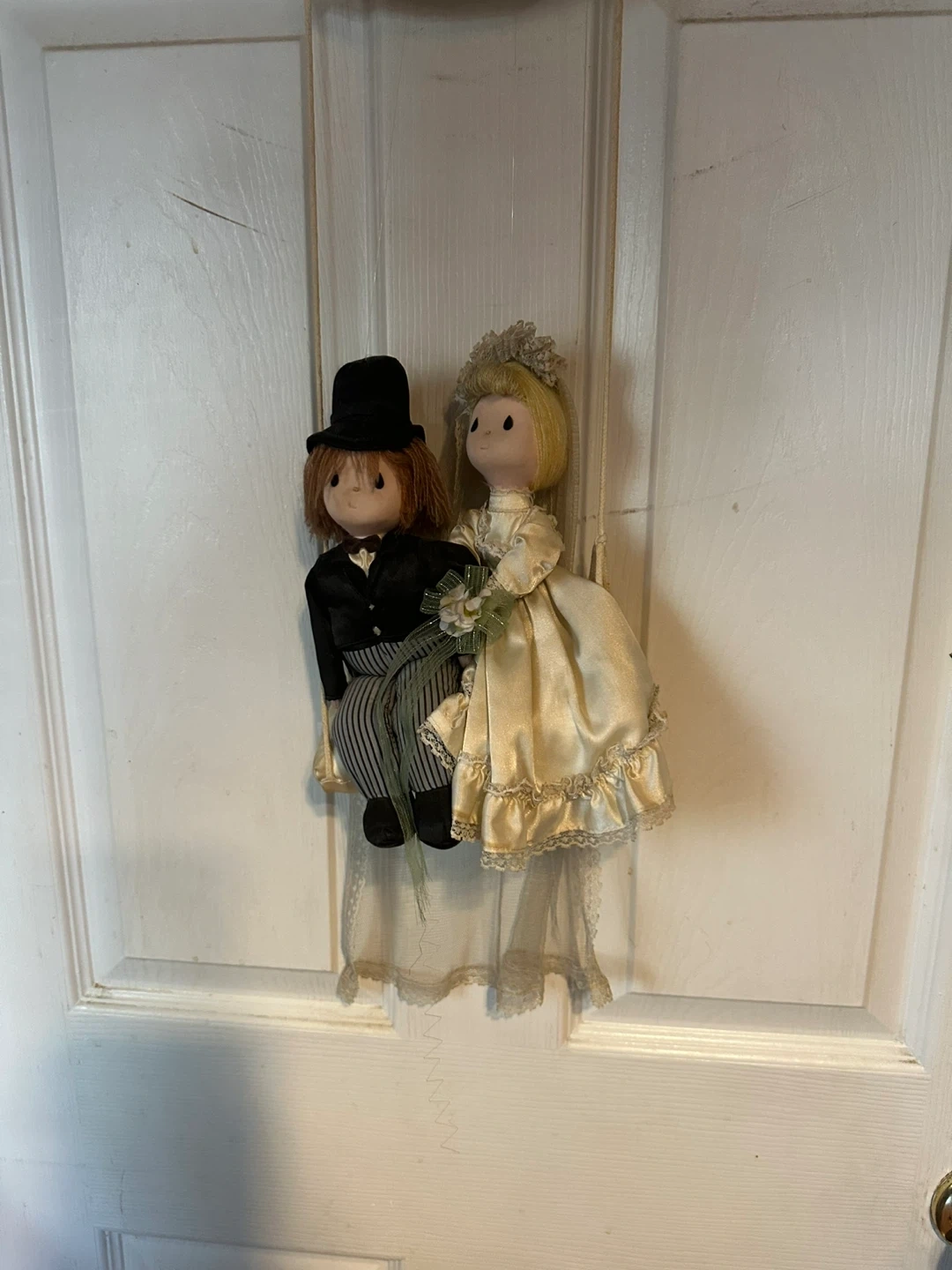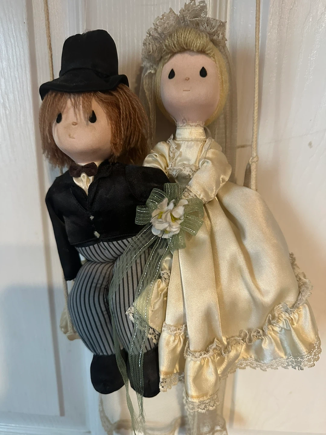 Cute vintage bride and groom dolls. They are hanging from a door hanger. Perfect for wedding decor or a collector!