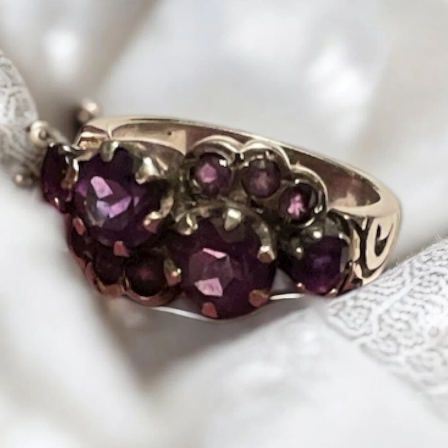 23Selling a vintage ring purple stones. Material: The ring is primarily made of 925 sterling silver. Gemstones: It features several purple gemstones, likely amethyst, the traditional birthstone for February. Some similar items use cubic zirconia (CZ) or other purple stones. Design: The band has an intricate scrollwork or filigree design. This design is often associated with vintage, Victorian, or Art Deco styles. Style: This type of ring is commonly found as a fashion, cocktail, or promise ring and is available in both new and vintage conditions.
