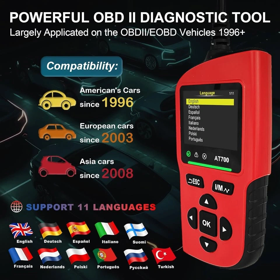 πŸš— ZOFAZ AT700 OBD2 Scanner – Professional Car Diagnostic Tool βœ… Full-Function Vehicle Diagnostics: Quickly read & clear check engine codes, view live data streams (with graphs), check I/M readiness, freeze frames, and vehicle info (VIN, CIN, CVN). Know what’s wrong before heading to the repair shop β€” and save money! βš™οΈ Advanced Testing Features: Includes battery, ignition, and charging tests, plus O2 sensor & EVAP system monitoring. Helps improve fuel efficiency, reduce emissions, and keep your engine running smoothly. 🌿 One-Click Emission Test: Press one button to check emissions. πŸ”΄ Red = Fault detected 🟠 Orange = Pending issue 🟒 Green = Normal Simple, visual, and great for pre-inspection checks. πŸ–¨οΈ Data Review & Easy Printing: Replay diagnostic data anytime and print reports via QR code. Track your car’s health and avoid overcharging at repair shops. 🌍 Wide Compatibility: Works with all 16-pin OBD2 vehicles (USA 1996+, EU 2000+, Asia 2008+). Supports 11 languages including English, Spanish, French, German & more. 🏠 Portable & User-Friendly: 2.4” color screen, plug-and-play design β€” compact, lightweight, and easy to carry anywhere. Perfect for home or travel use.