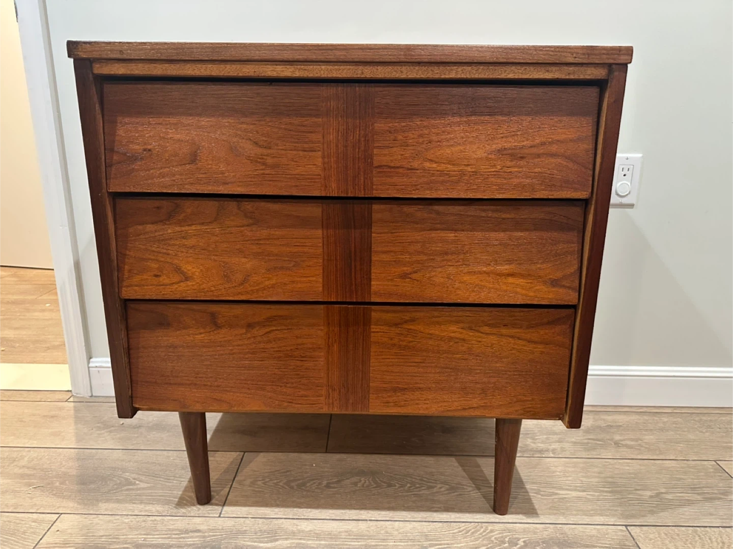 10Here's a refinished mid-century wooden dresser with three drawers—could be Ward furniture, but not sure. It's in good shape and perfect for adding some stylish storage to your space. The wood has a beautiful grain and warm tone. Some slight wear on top as seen in photoss. Vintage, as is.