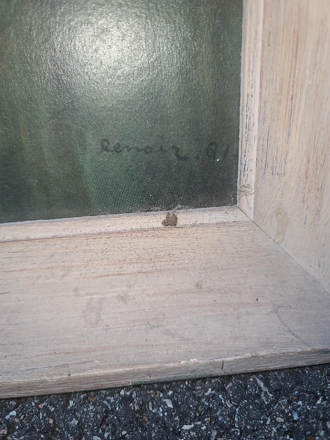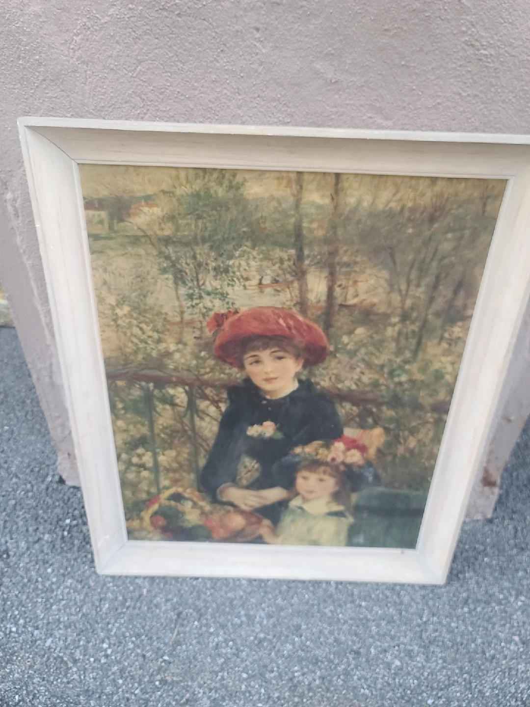 Selling a print of a painting by Renoir. It features a woman and child in a garden-like setting. The frame is a light color.