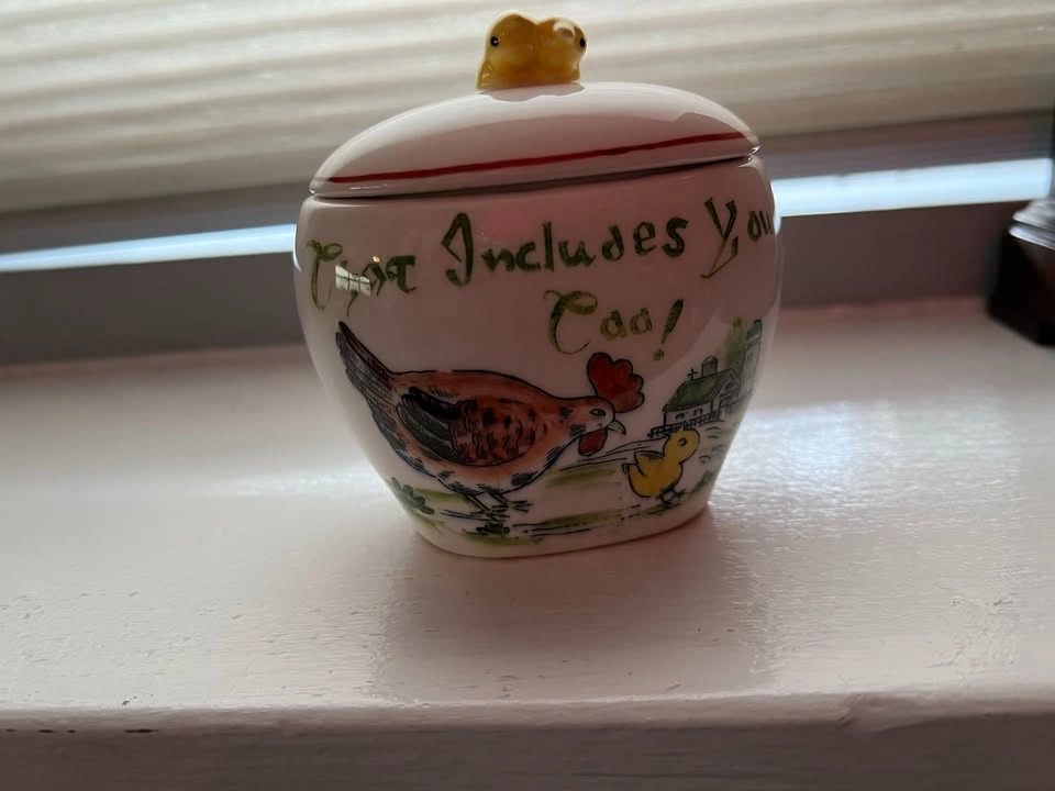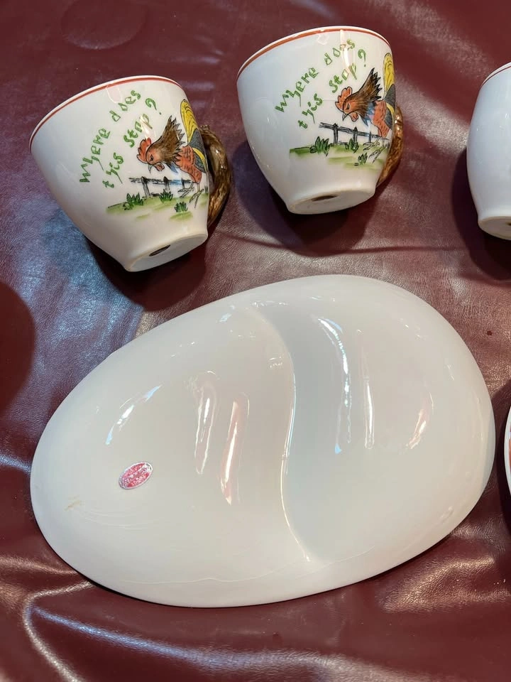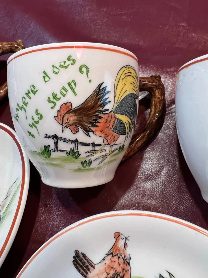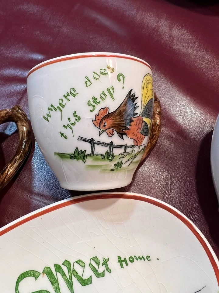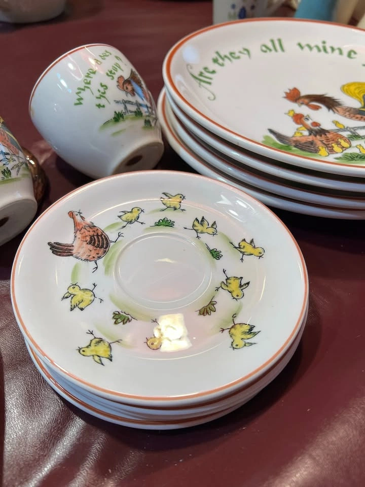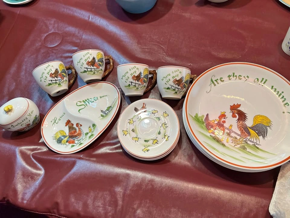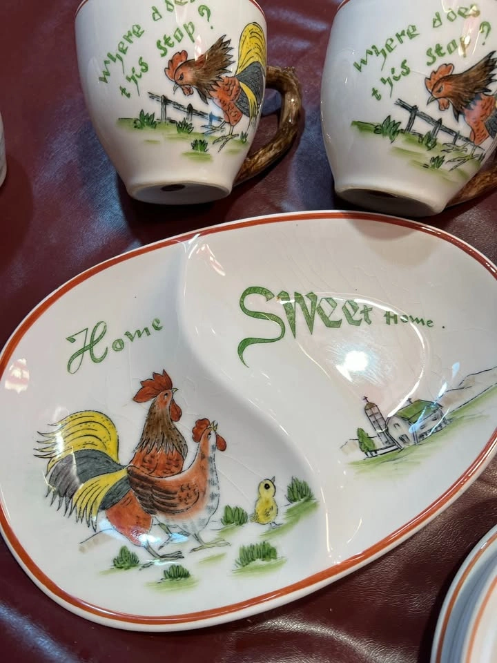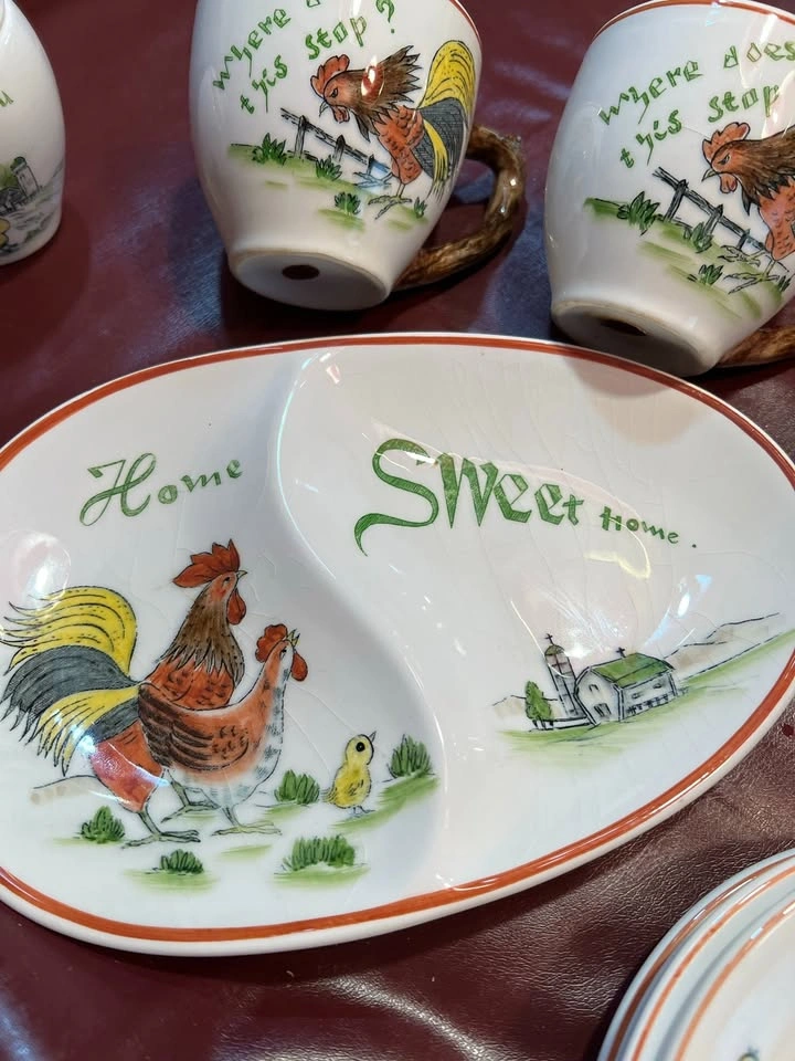 Vintage - Rooster and Chicken plates, Cups with Saucers Set of 4. One fancy divided server platter. Sugar Bowl. Home Sweet Home and Where does this stop? and Are they all mind? Very nice collection if you are a Rooster or chicken lover. Very clean and no chips Text Cindy Prefer pick up