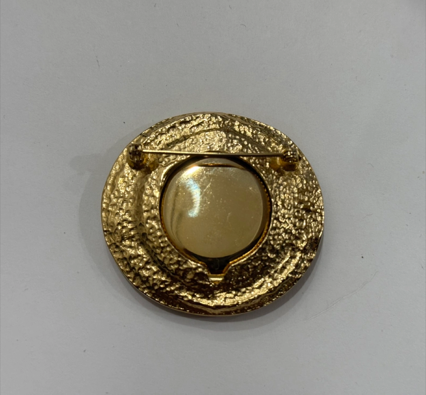 A beautiful gold-toned brooch. A round shape with a layered design. A secure pin closure on the back. Could be used to pin a scarf, add some flair, or match your accessories!