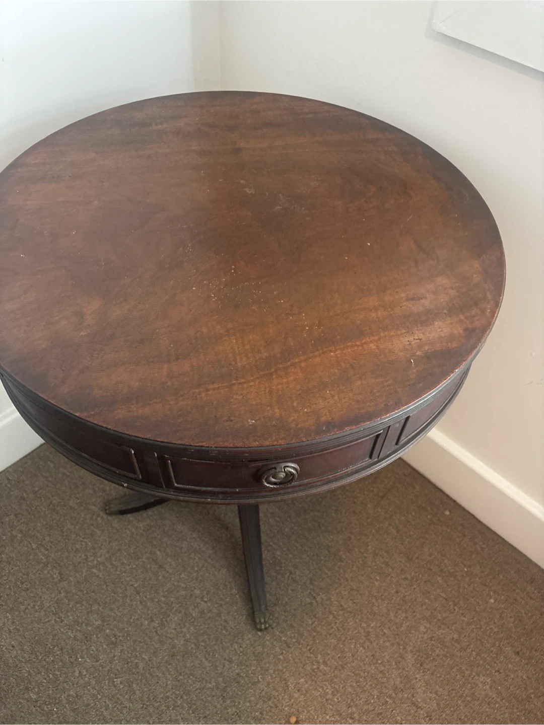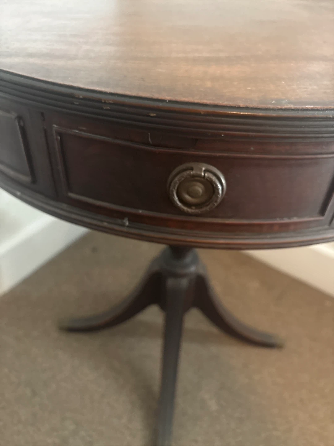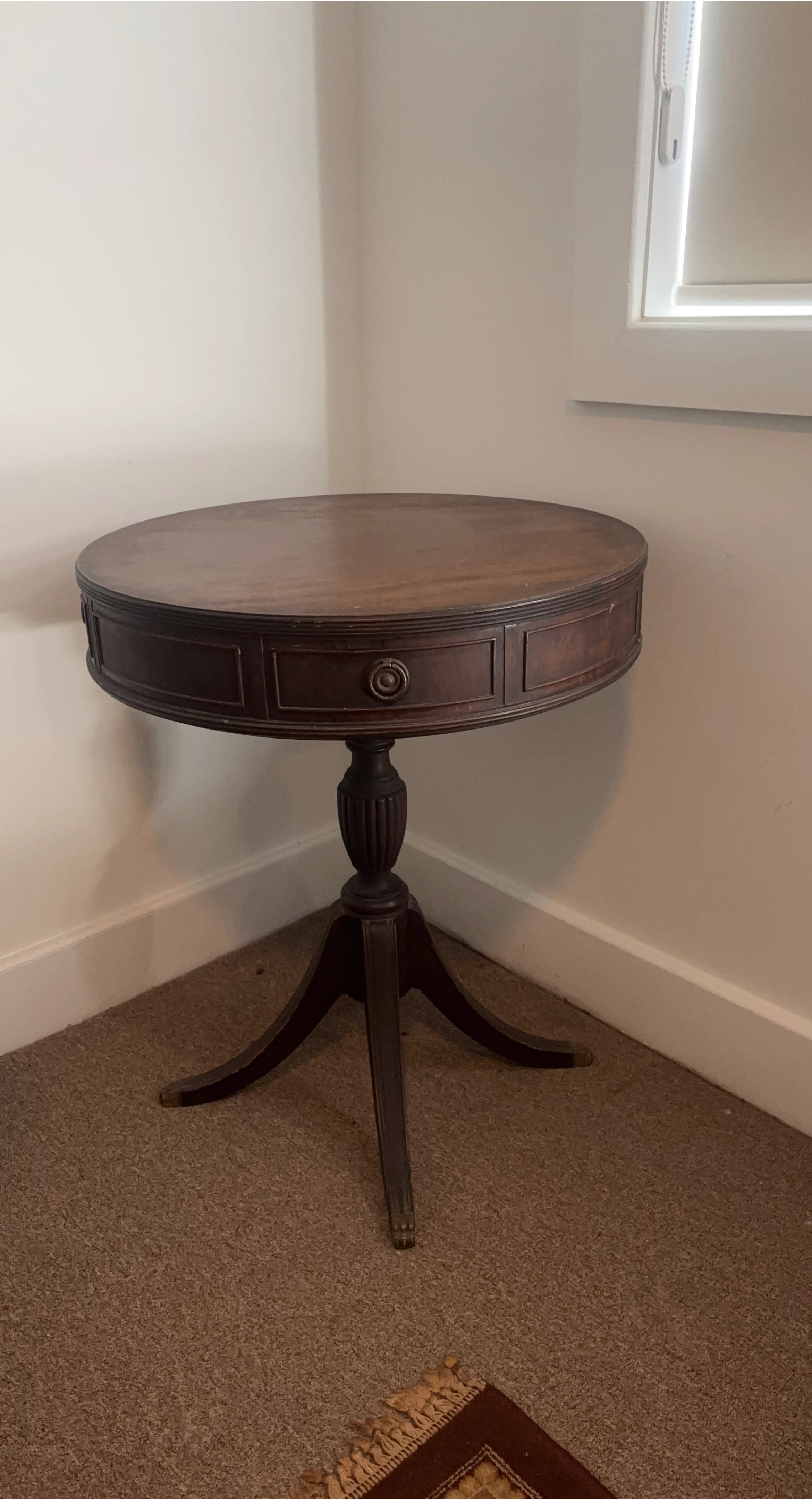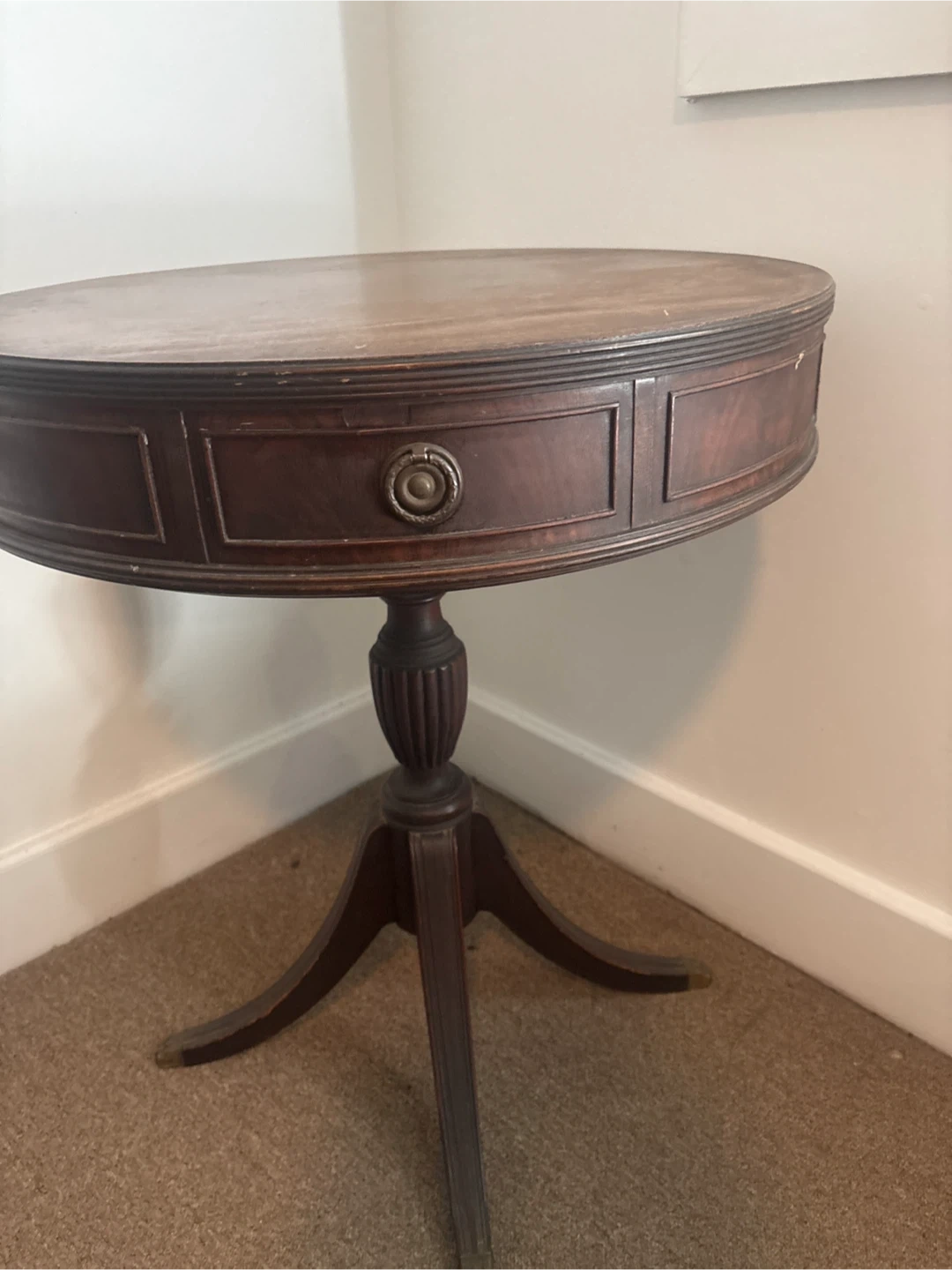 Selling a round mahogany end table. It has a classic design with a pedestal base and a small drawer for storage. It would be a nice addition to any living room or bedroom