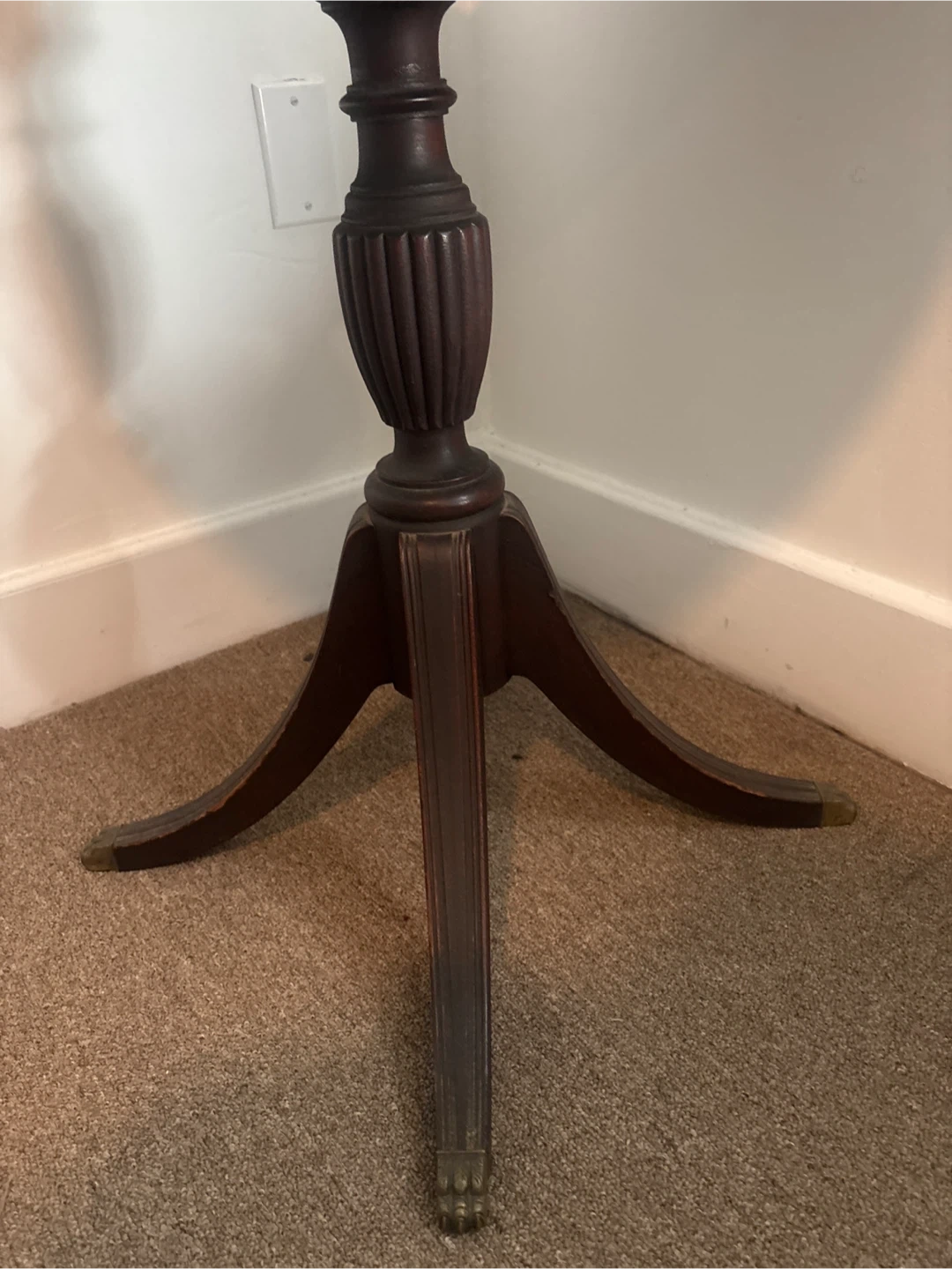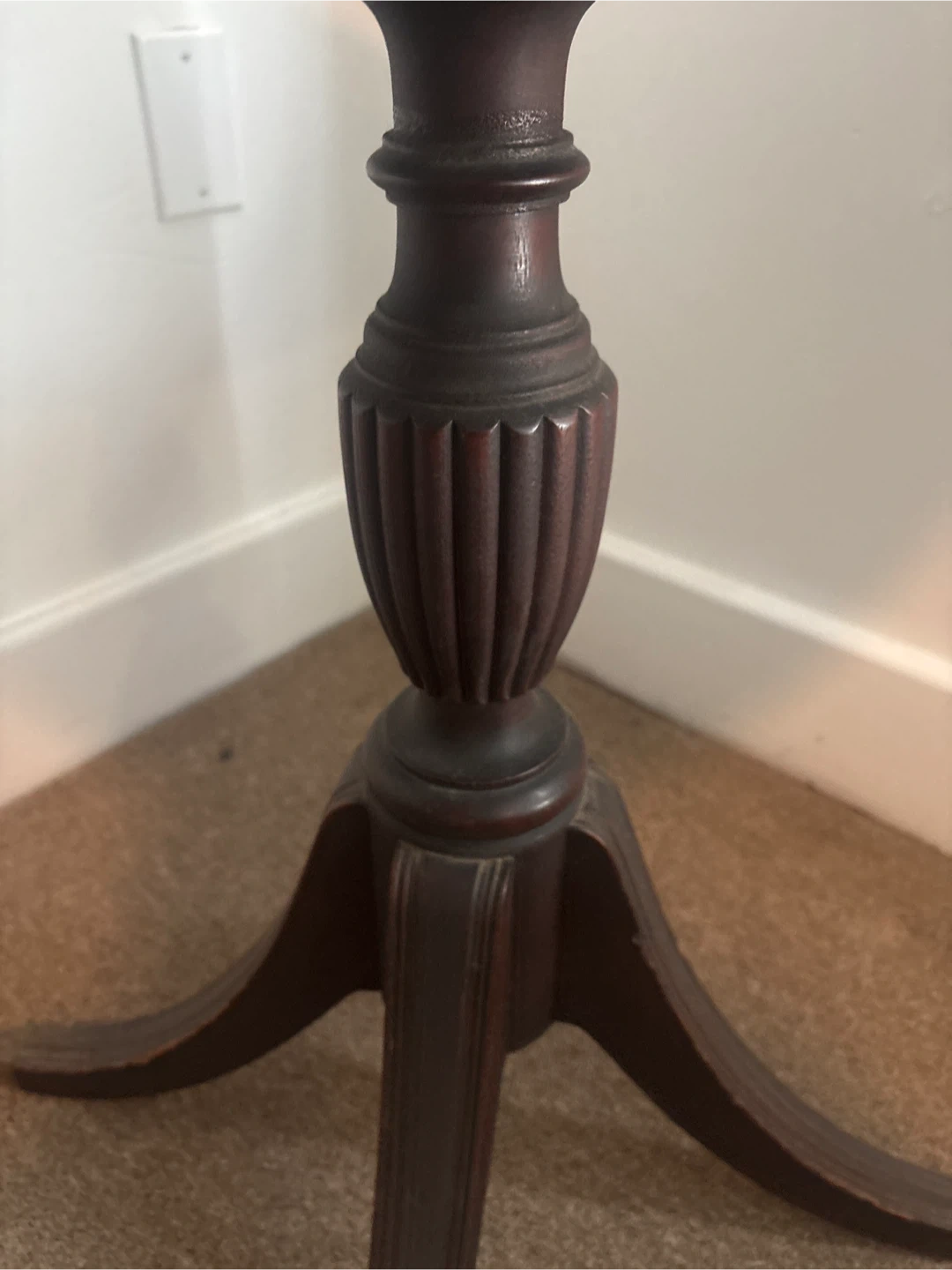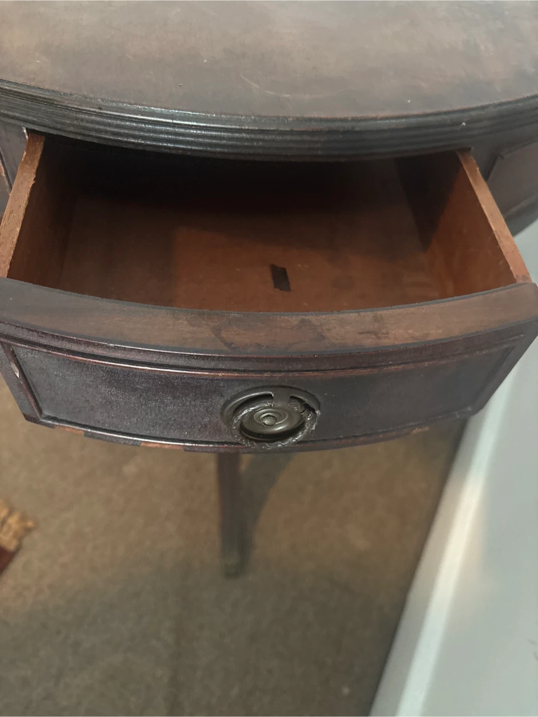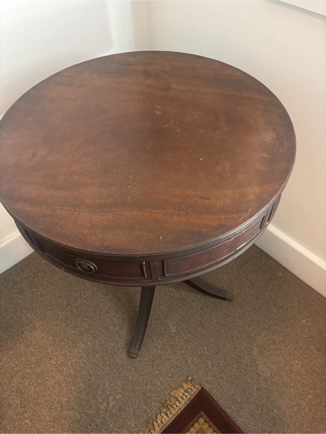 Selling a round mahogany end table. It has a classic design with a pedestal base and a small drawer for storage. It would be a nice addition to any living room or bedroom