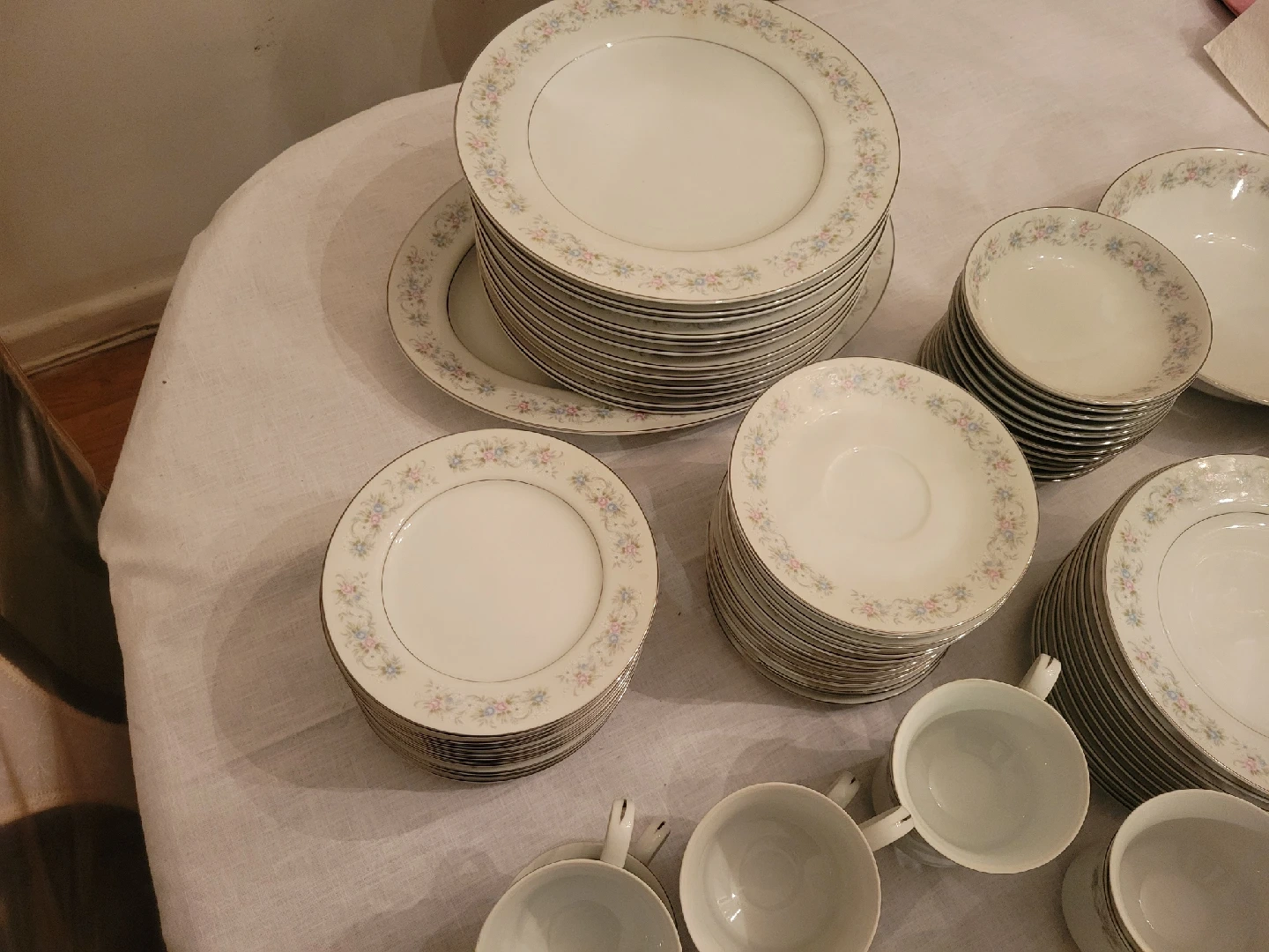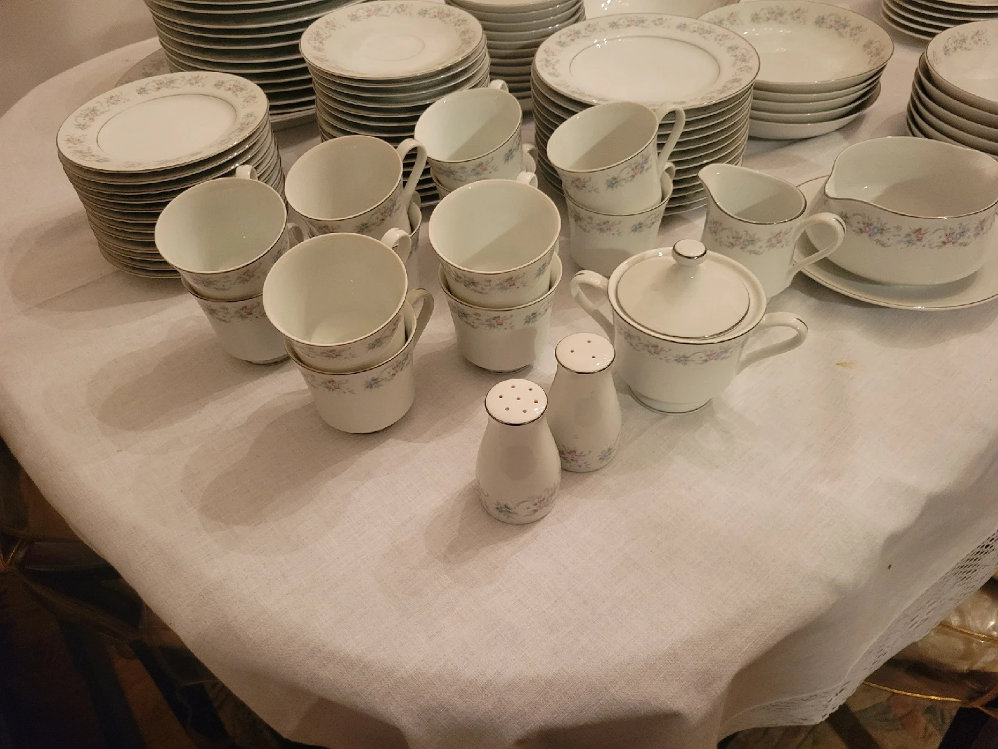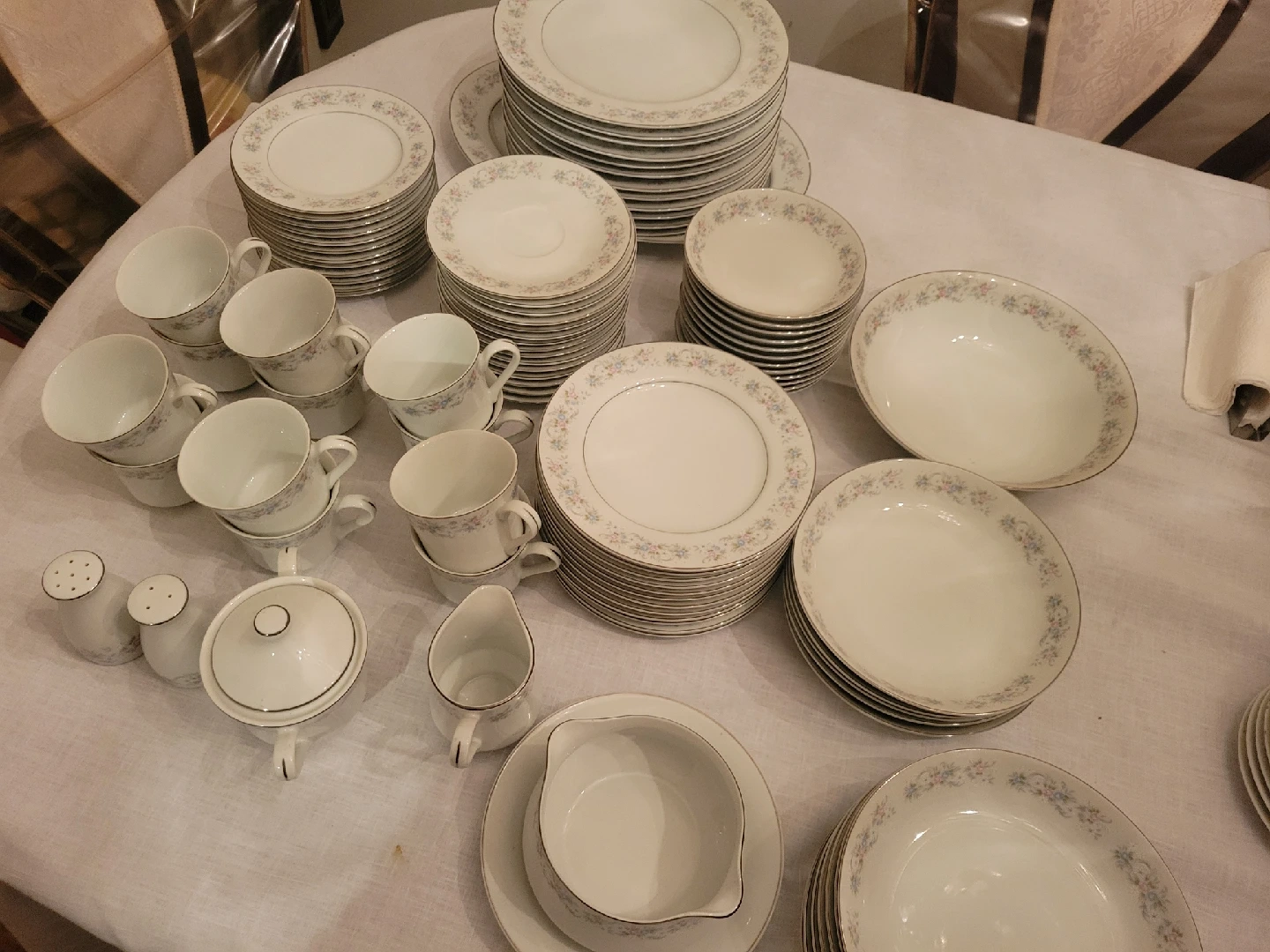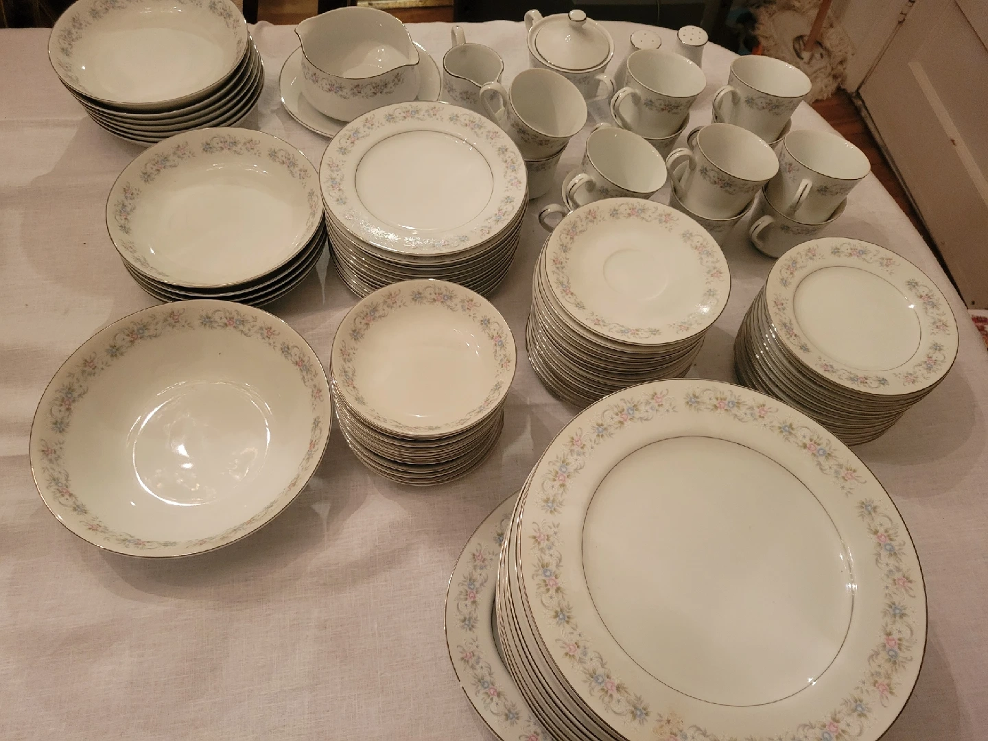 65Selling a complete set of Royal Albert 'Memory Lane' china. This elegant set features a delicate floral pattern and includes dinner plates, salad plates, bowls, cups, saucers, and serving pieces. Perfect for adding a touch of vintage charm to your dining experience!