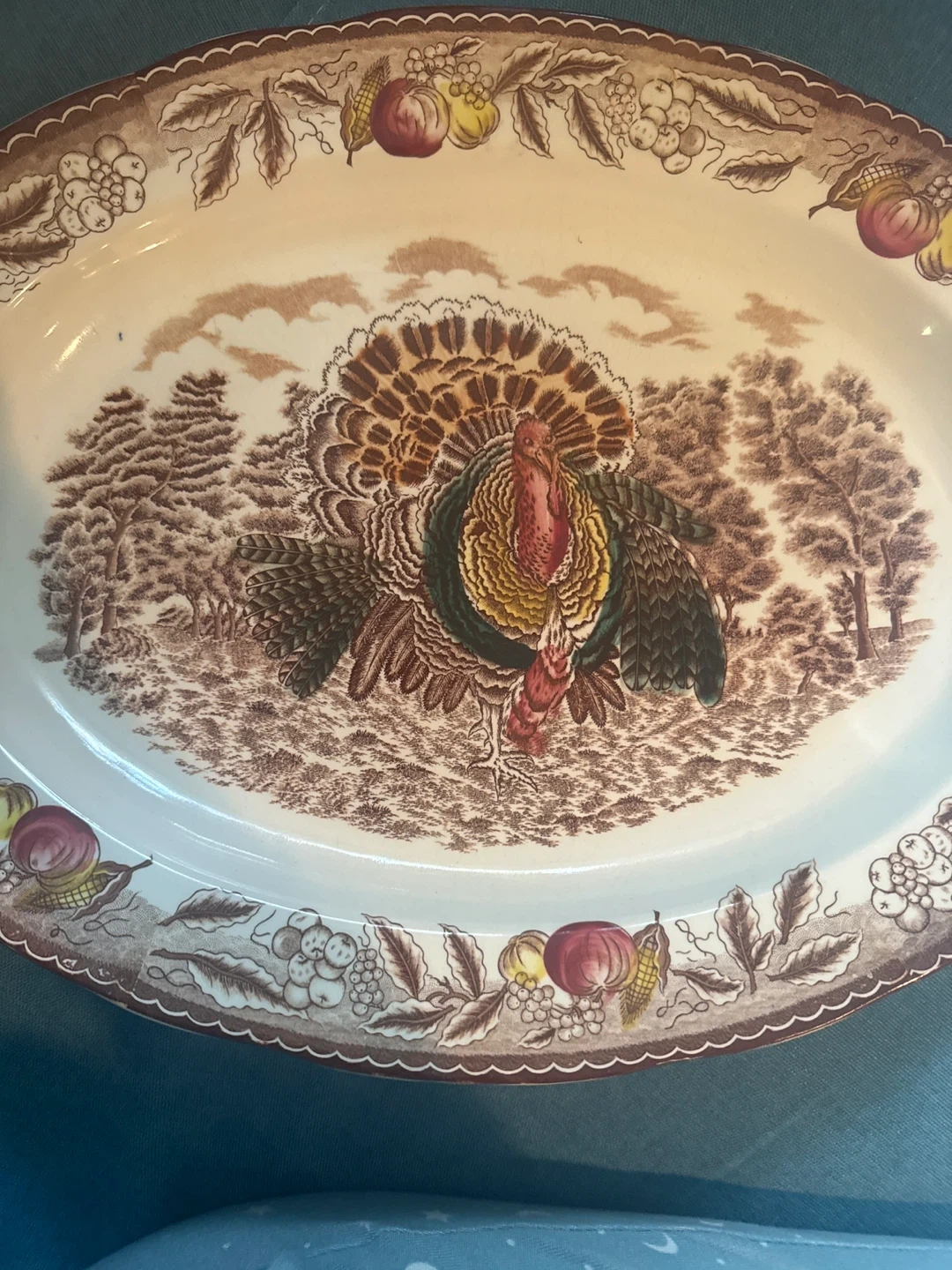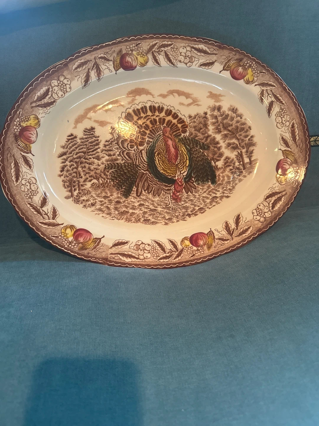 Selling a beautiful vintage Royal Staffordshire turkey platter! It features a detailed turkey design in the center surrounded by a decorative fruit and foliage border. Perfect for your Thanksgiving or holiday table!