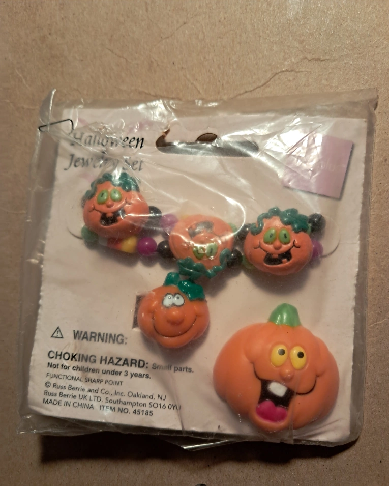 Selling a vintage Halloween jewelry set by Russ Berrie, still new in its original packaging! The set features adorable pumpkin-themed pieces. Perfect for adding a spooky touch to your Halloween attire!