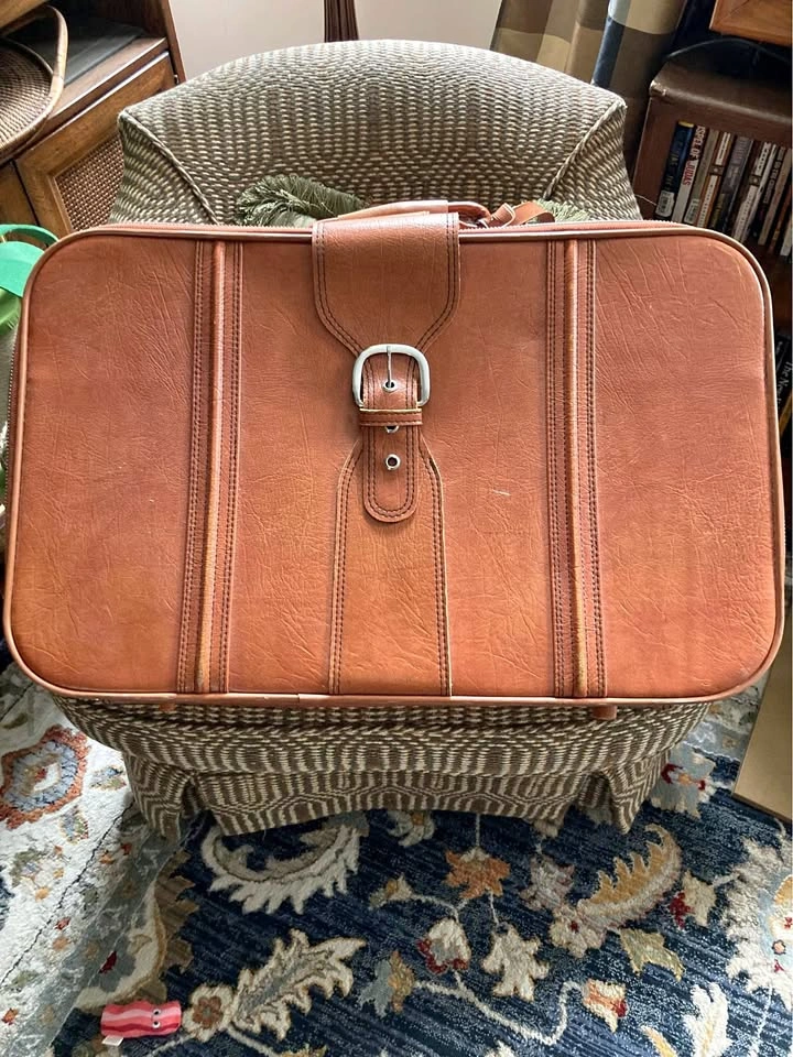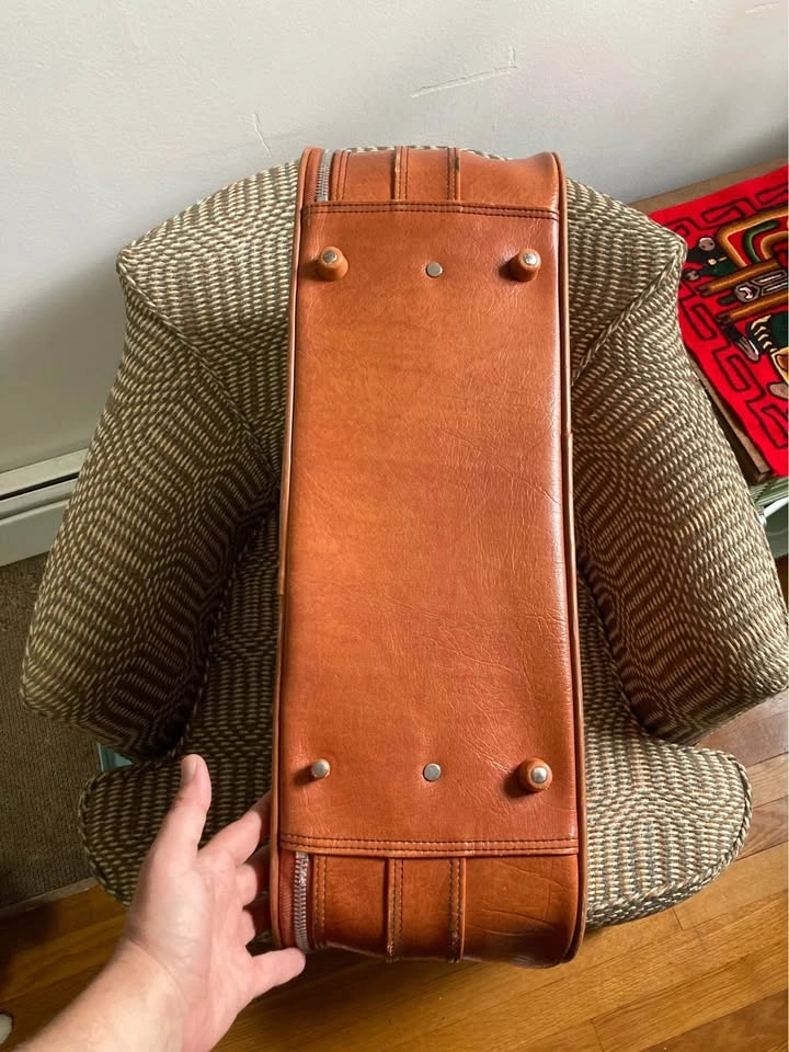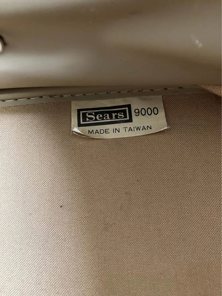 65Available for pickup in portage park area. Vintage Sears series 9000 faux leather luggage with working lock and 2 keys. Buckle closure in front. Name tag has never been used, concealed under a privacy flap, with clasping closure.